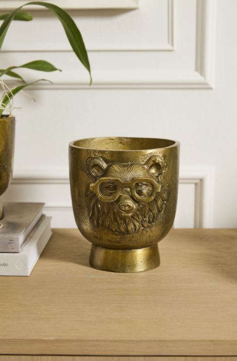 Made from recycled cast aluminum with a charming antique gold finish, this cute footed planter showcases a bear with glasses design and holds a 6-inch drop-in pot. It’s perfect for decorating with a festive tree, blooming flowers, or fresh holiday arrangements.