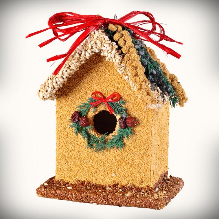 A delightful treat for your favorite backyard birds and a thoughtful gift for any bird-lover. Delicious and delectable premium bird seed and fruit coat this wooden bird house. Once the seed is consumed the birds may nest in this durable house for seasons to come.