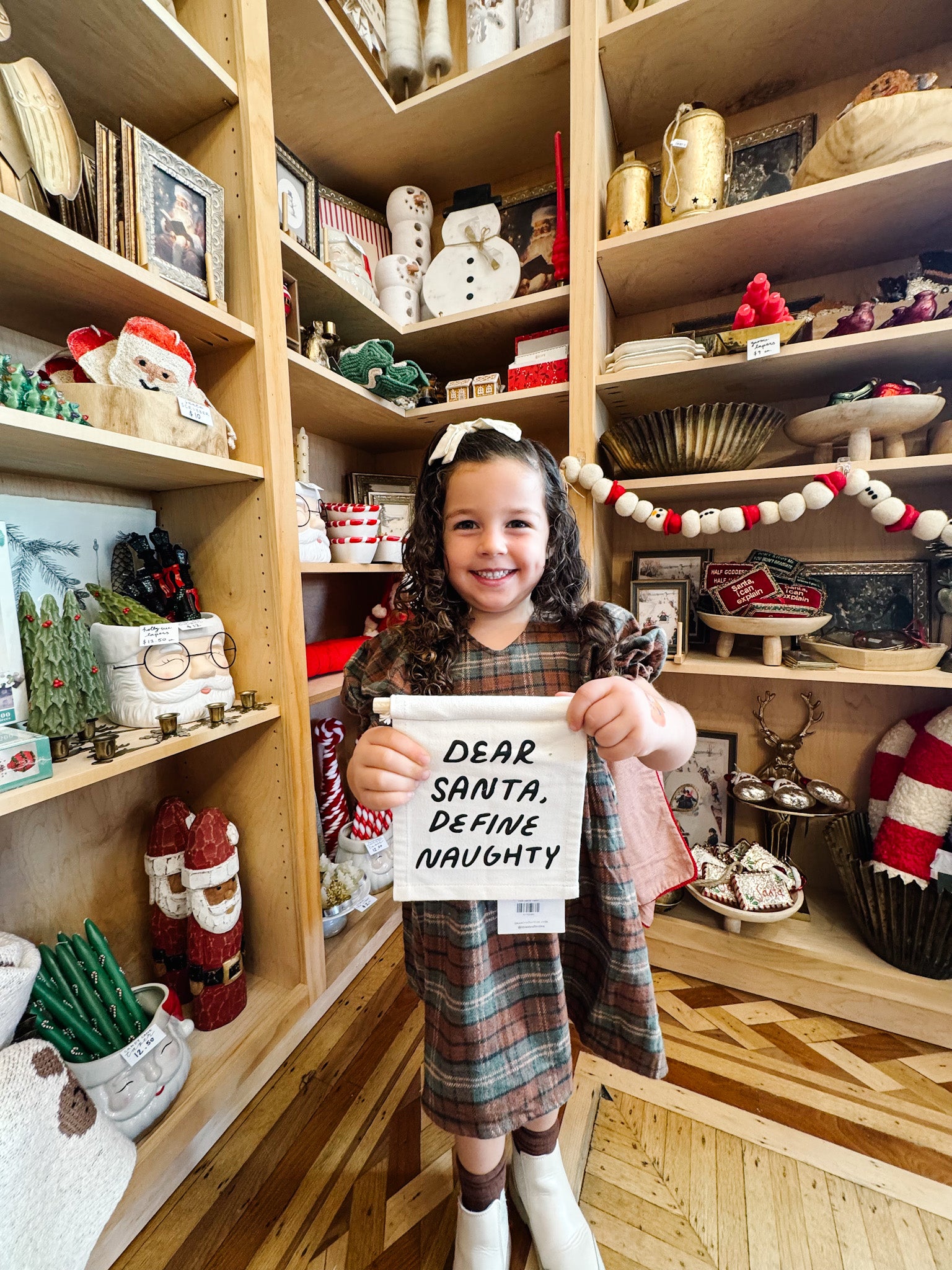 A little sass for the season. This canvas banner adds a wink of humor to your holiday decor with bold black lettering and that familiar festive gray area. Hand-sewn and screen printed by artisans in Kenya using natural canvas, a poplar dowel, and cotton thread.