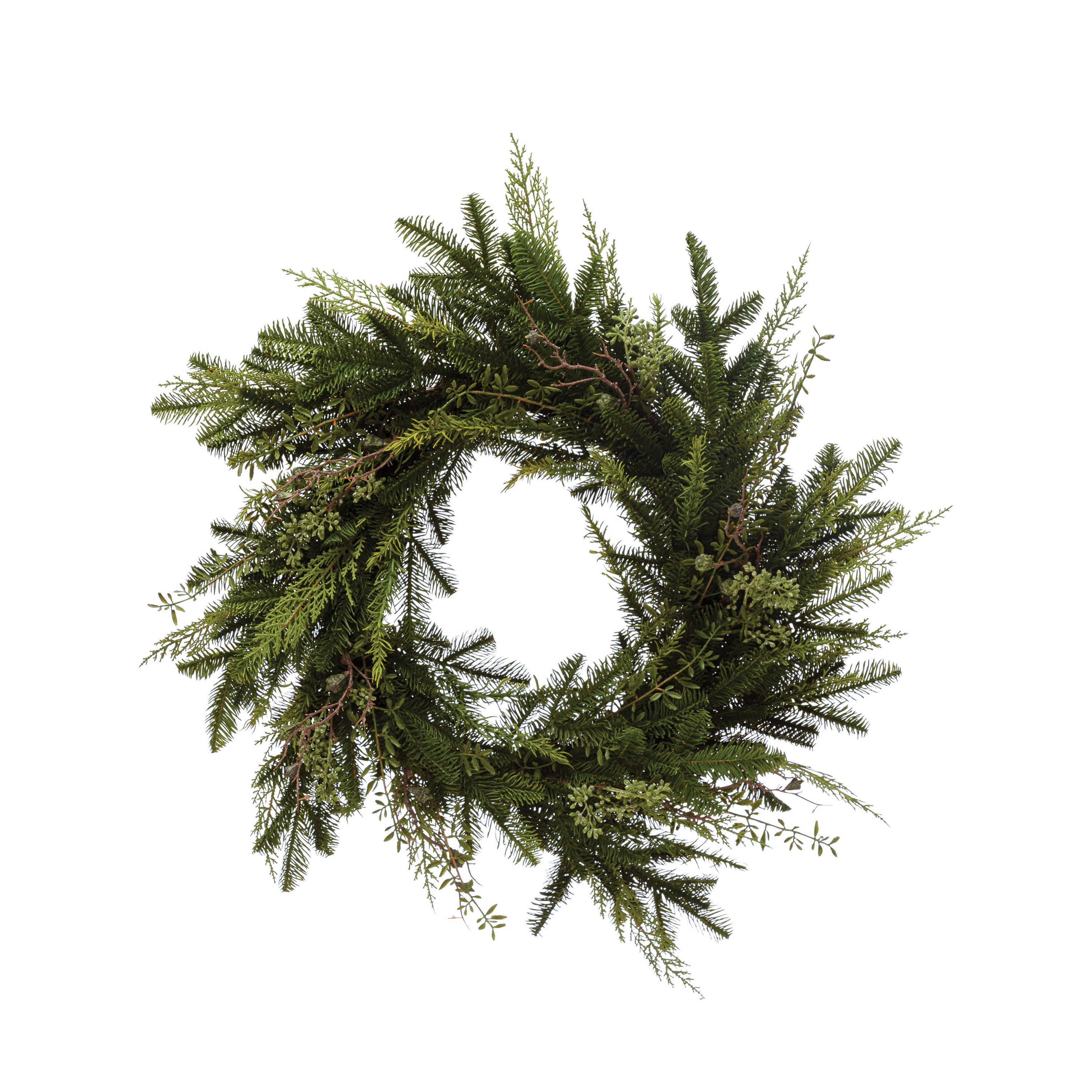This wreath is made from faux mixed evergreen and is 30" in diameter.