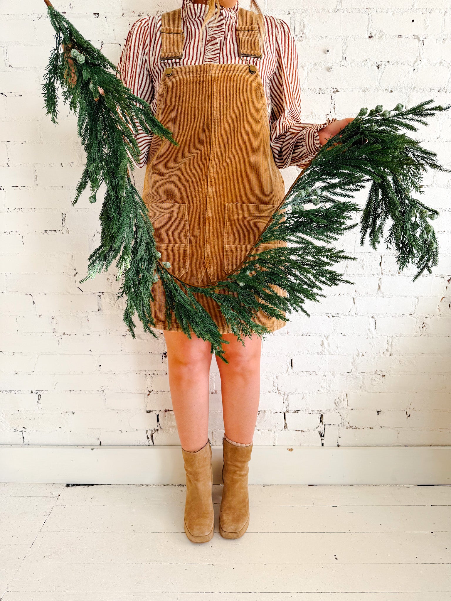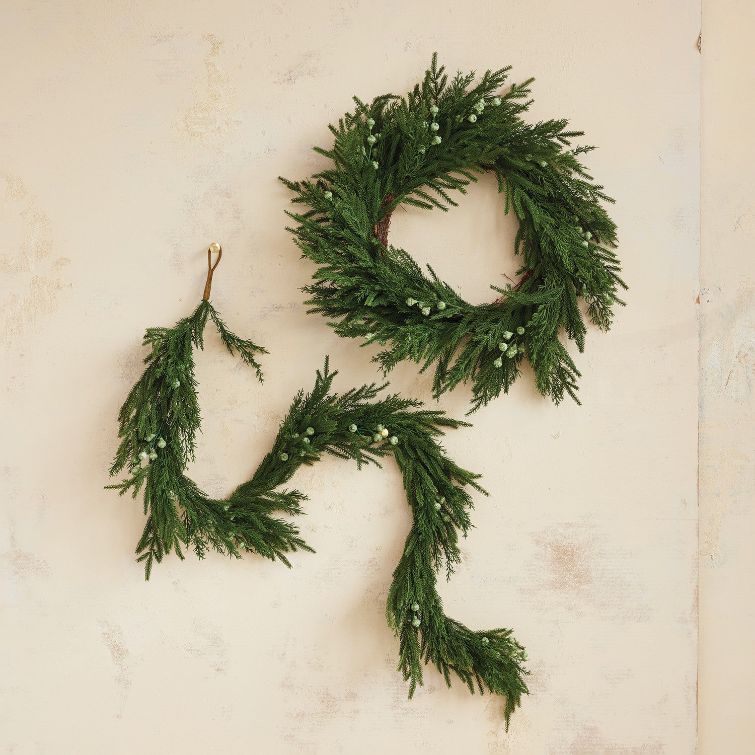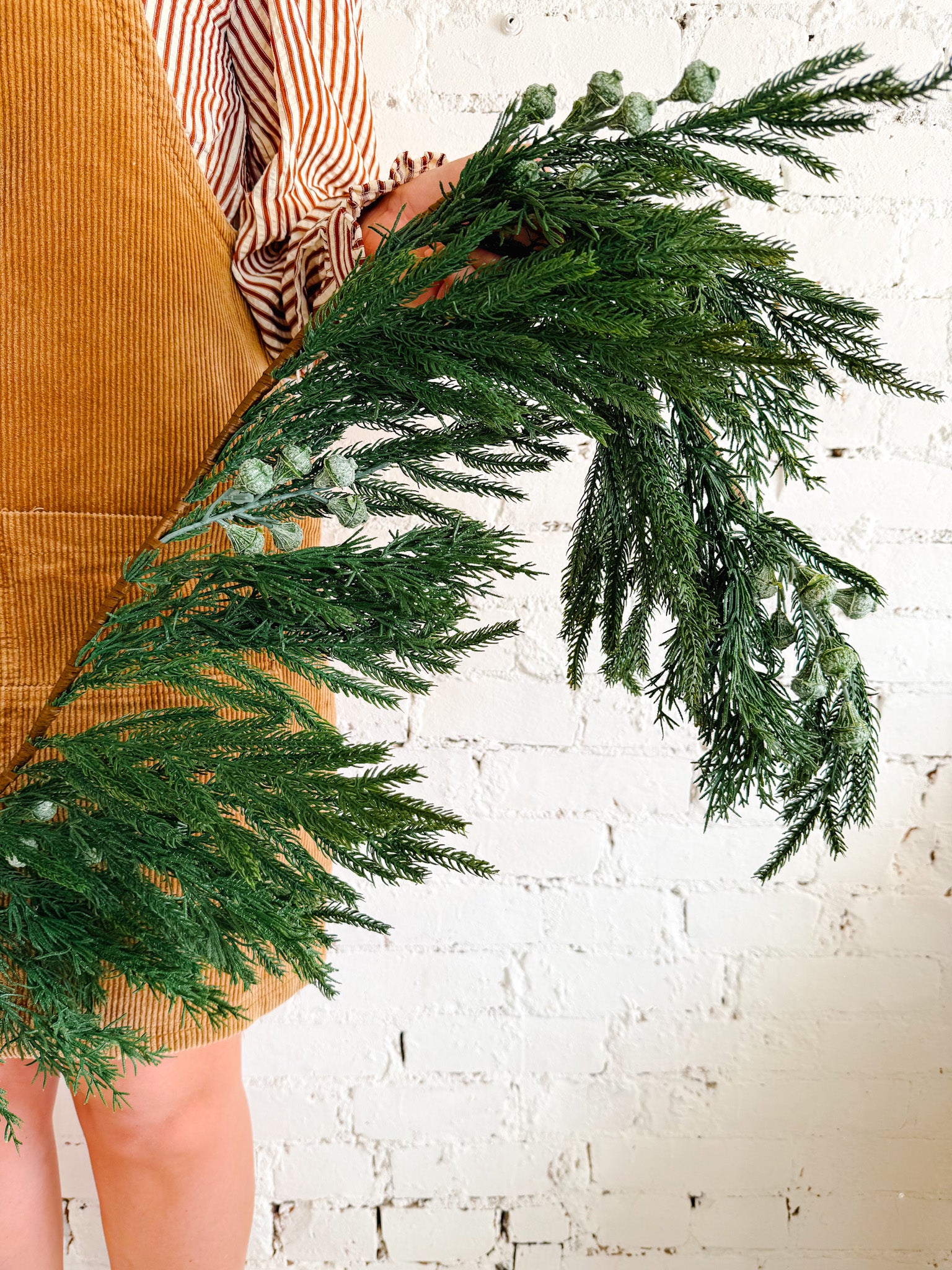 Its soft greenery and gentle pods layer beautifully, adding depth and texture whether draped over a mantel, woven along a stair post, or styled across a foyer table. Use it alone for a clean, understated look, or mix it with candles, pinecones, ornament garland, or string lights to build a cozy, layered look that feels both timeless and inviting. Perfect for holiday decorating or simply bringing a touch of peaceful woodland charm to any room, all season long.