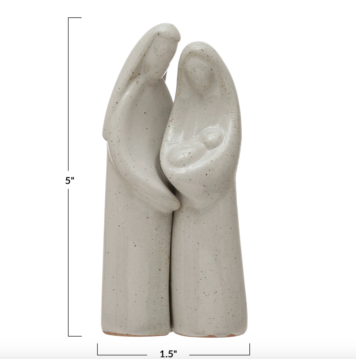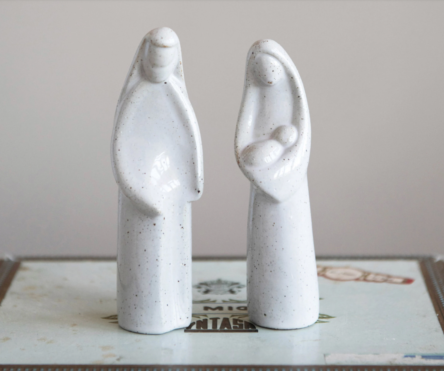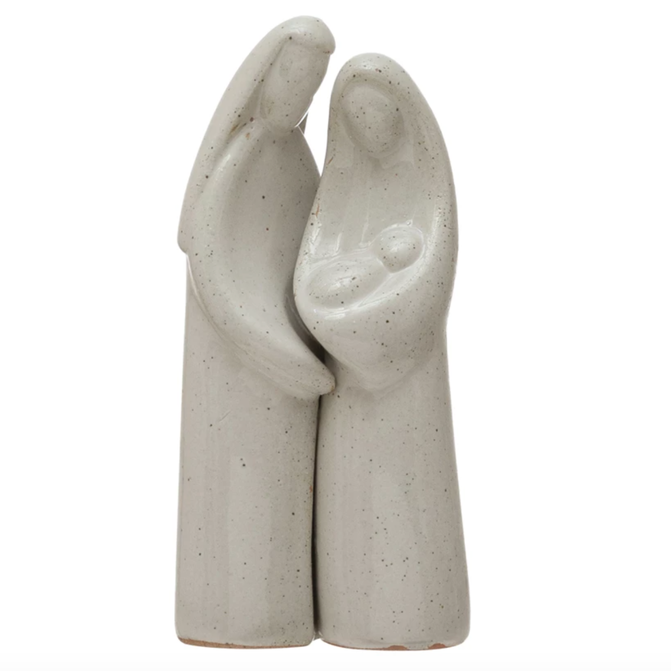 This Stoneware Holy Family set features Mary, Joseph, and Jesus as a charming decoration for the Christmas season. Crafted from stoneware with a white speckled finish, it complements any style of decor. Sold as a set of two, these neutral pieces fit perfectly on shelves or furniture, adding a subtle festive touch.