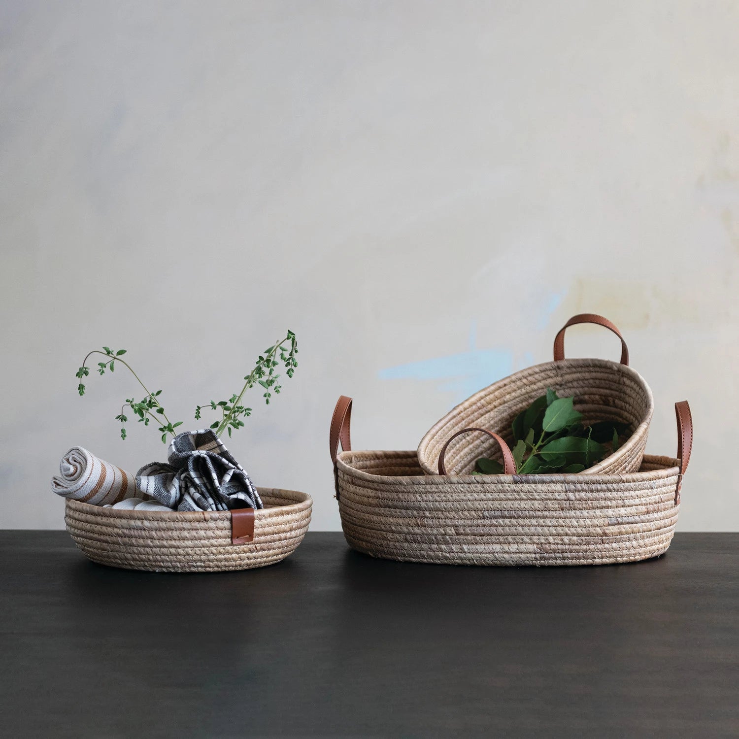 Sold Individually...These handwoven oval baskets bring an easy, natural feel to any space, blending seagrass and water hyacinth with warm faux leather handles for a simple but elevated look. Perfect for styling on shelves, entry tables, or countertops, they’re great for holding fruit, hand towels, toys, or even as a catch-all for everyday essentials - basically functional storage that also looks really good doing nothing at all.