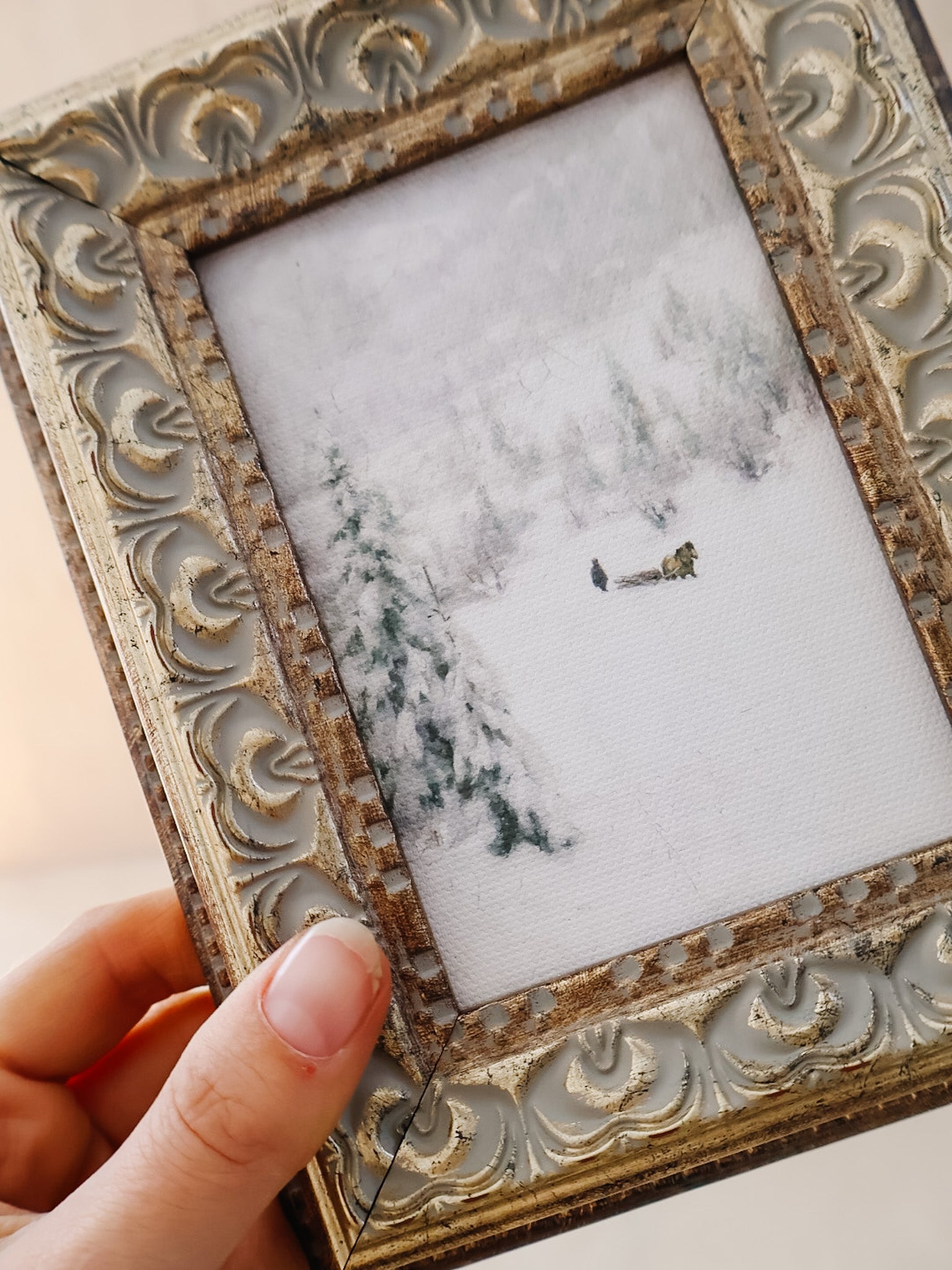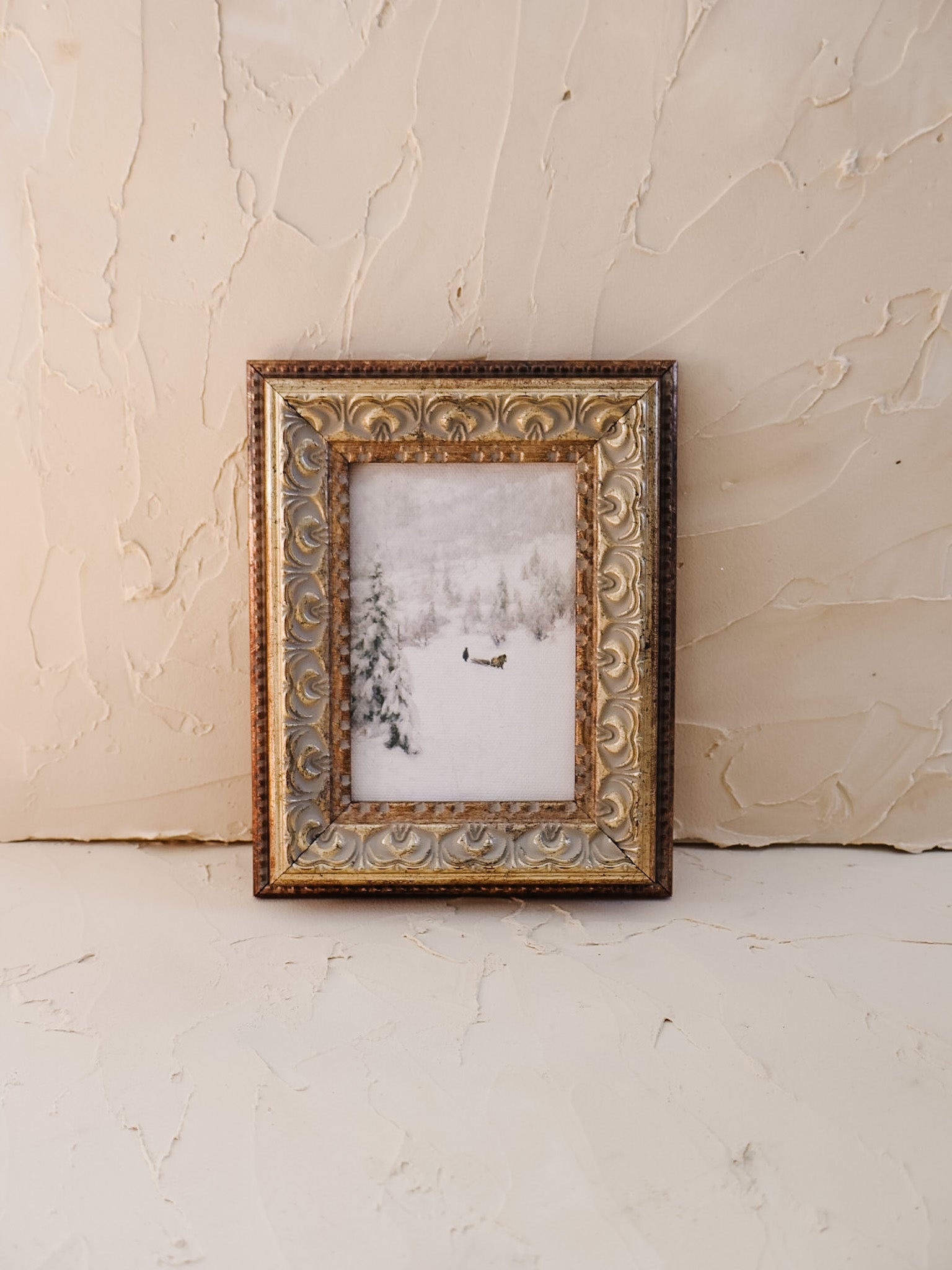 This vintage-inspired landscape depicts a snowy, winter scene with a figure and animal in the distance. It is printed on raw canvas and placed in an antiqued frame for an authentic, timeless look. Looks stunning in a small wall space, on a shelf or ledge, or as a part of a gallery wall.