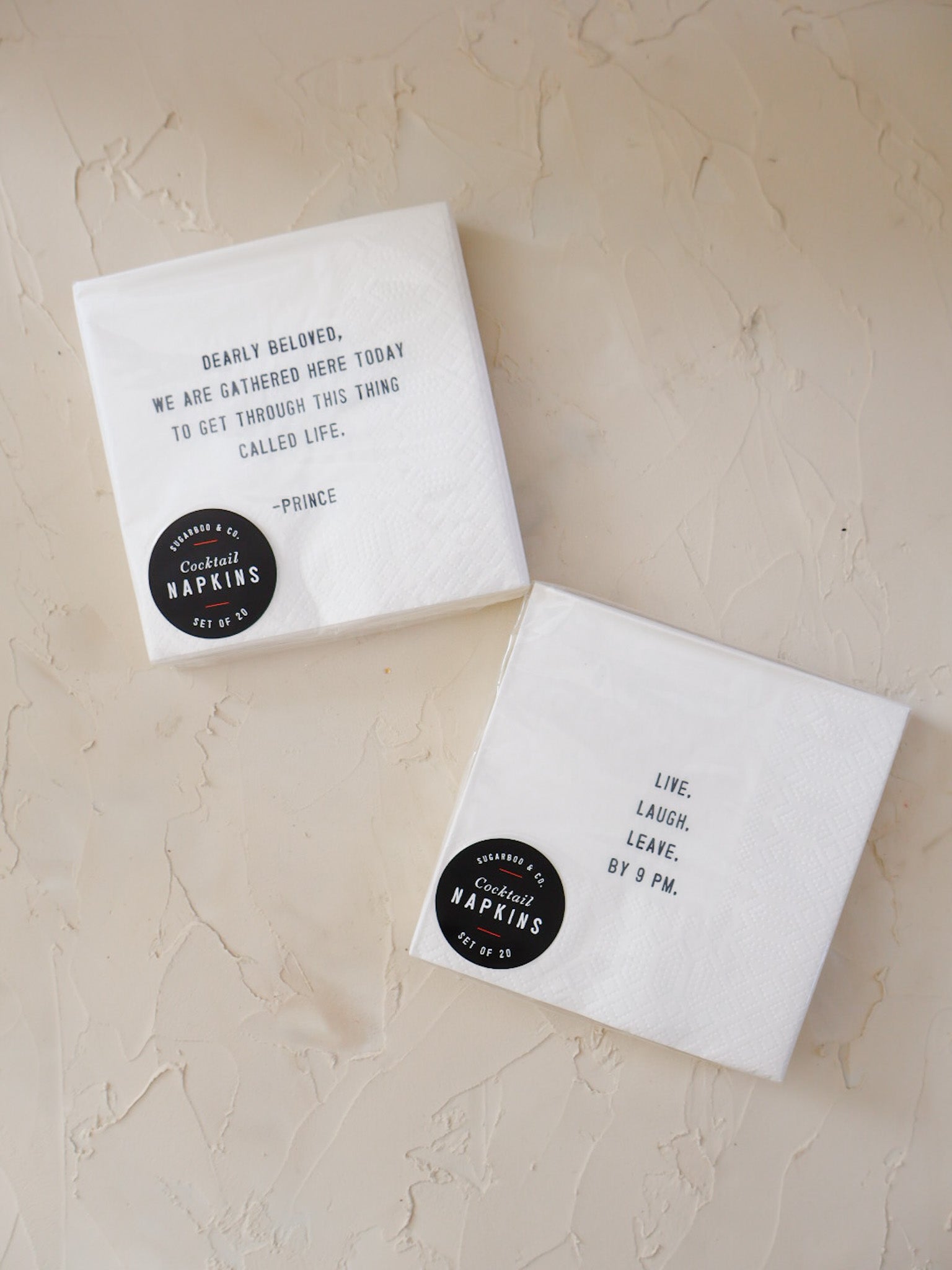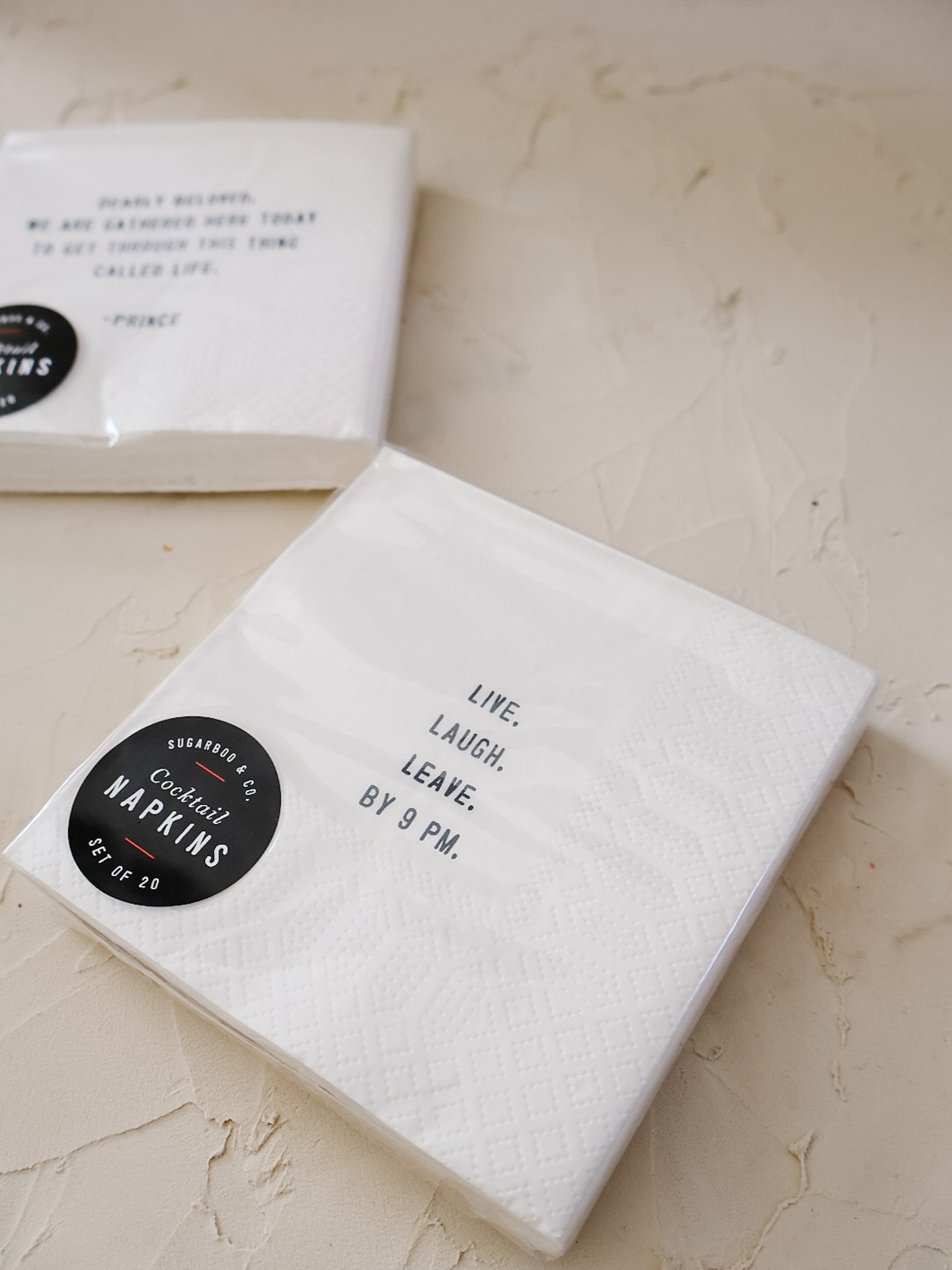 Each package of 20 cocktail napkins contains the quote "Live. Laugh. Leave. By 9pm