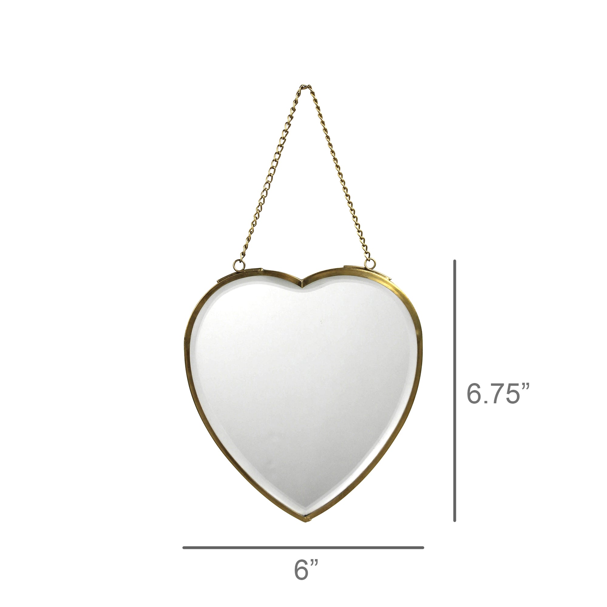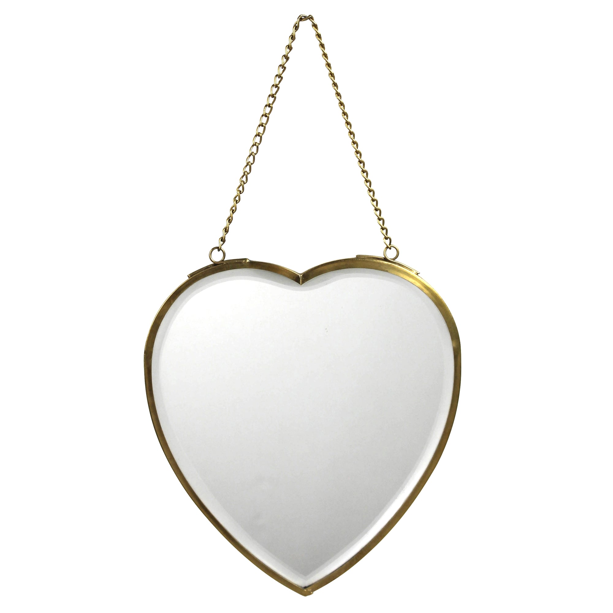 This gorgeous heart mirror has a metal frame and chain with a brass finish. It is a beautiful addition to a gallery wall or a small space that needs a wall accent.