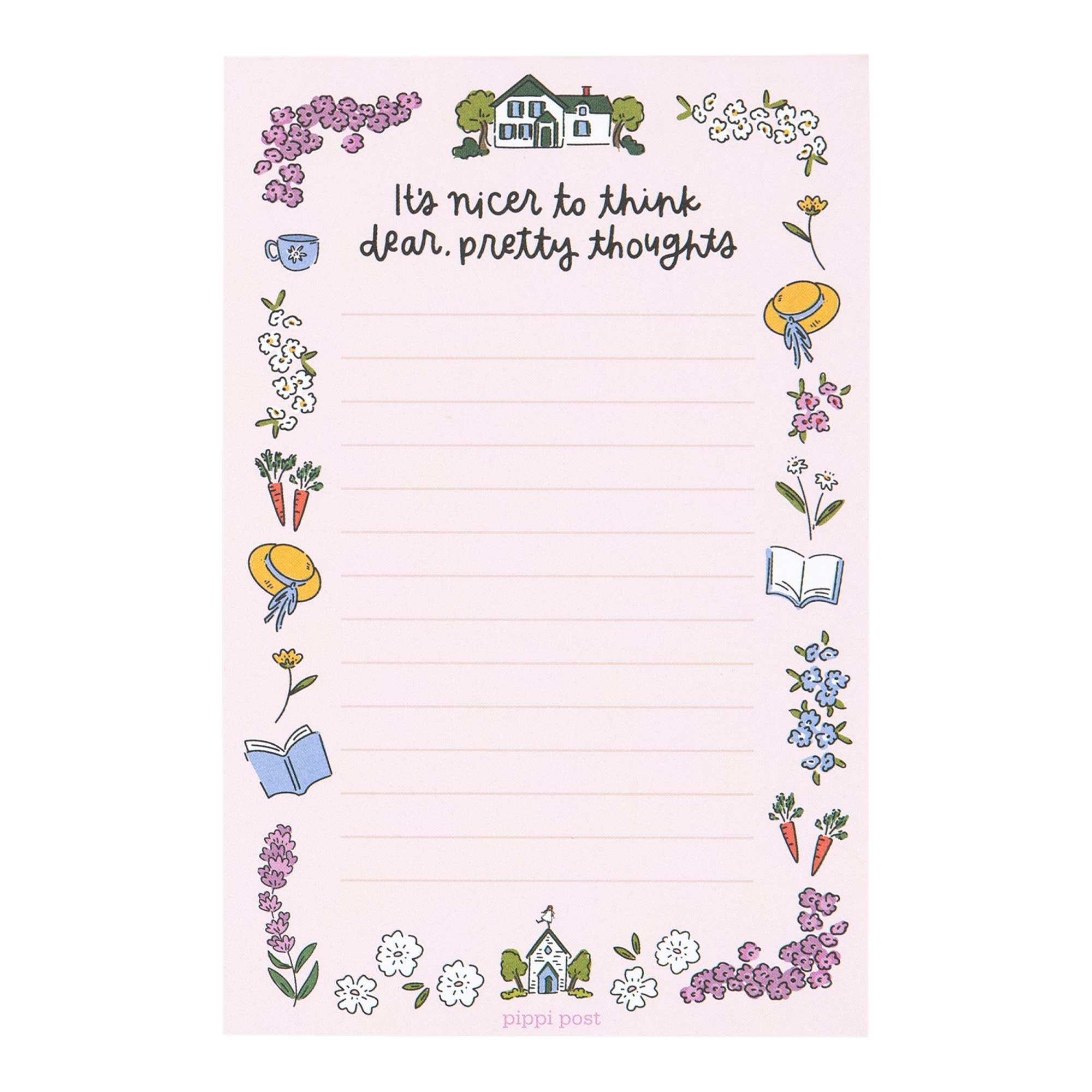 Put pen to paper with Anne Shirley-inspired charm! This 4x6 notepad features the heartwarming quote, “It’s nicer to think dear, pretty thoughts,” framed by hand-drawn illustrations of Green Gables, florals, books, and garden details. Perfect for daily lists, journaling, or gifting to Anne of Green Gables fans, book lovers, and writers who adore a touch of whimsy!