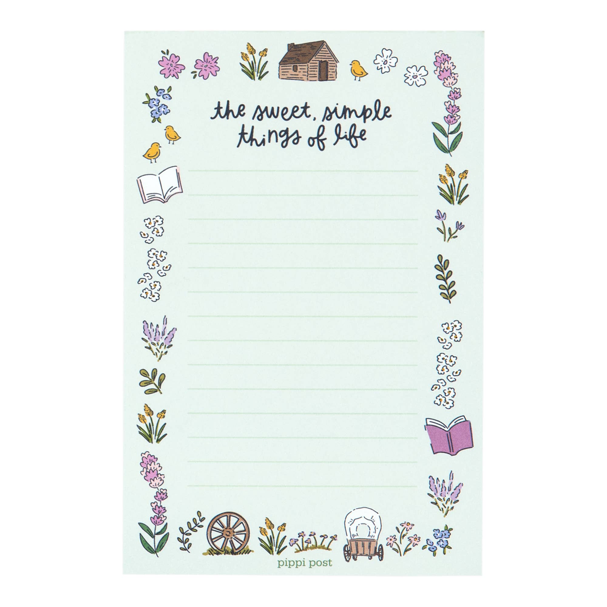 Jot down your ideas with a cozy prairie vibe! This 4x6 notepad showcases the phrase, “The sweet, simple things of life,” framed by charming hand-drawn sketches inspired by Laura Ingalls Wilder’s homestead—think log cabins, wagon wheels, flowers, and open books. Ideal for everyday notes, journaling, or as a thoughtful gift for fans of Little House on the Prairie, bookworms, and anyone who appreciates life's quiet, beautiful moments.