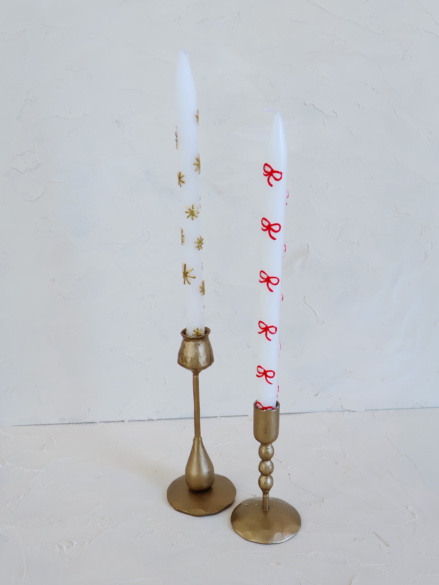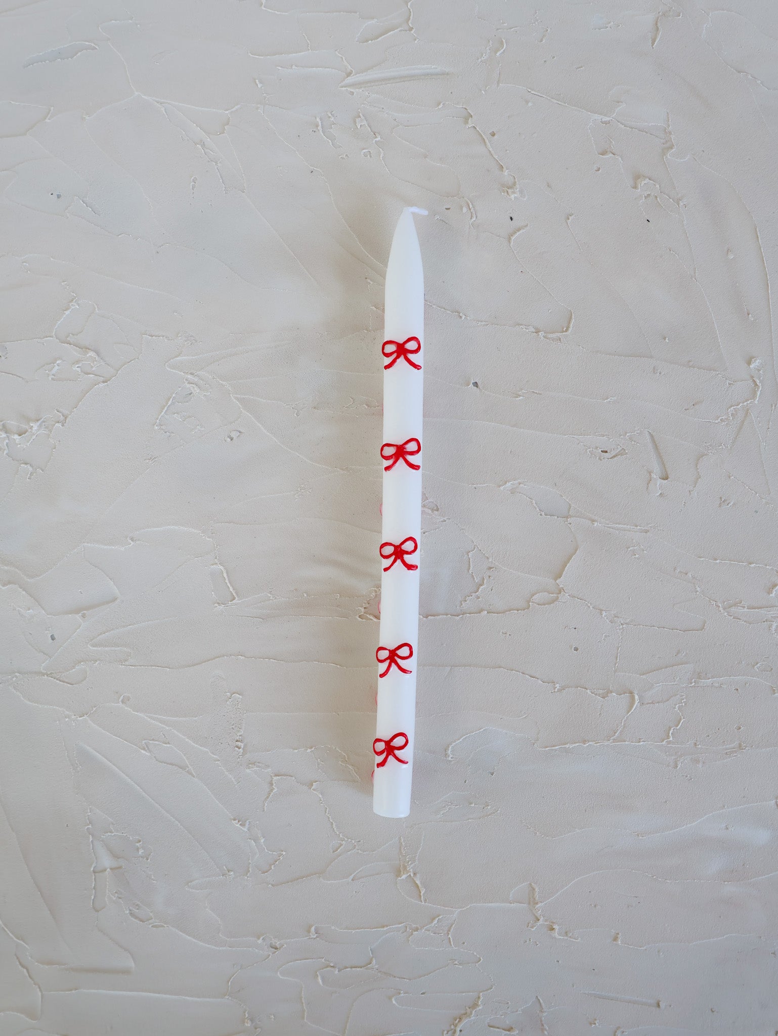 Sold Individually...These white taper candles, hand-painted with festive red bows, bring just the right touch of fun holiday magic. Nestle them into a pair of brass holders on your mantel, weave them between fresh cedar on a table runner, or let them flicker in a windowsill with snowy scenes just beyond the glass. They’re sweet in a centerpiece with cranberries and pinecones, or on a bedside table for quiet winter evenings with cocoa and a worn novel.