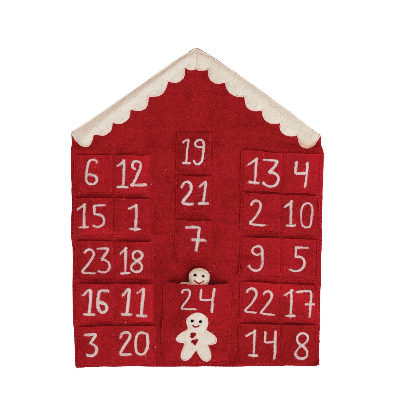 Count down to Christmas with this red and white handmade wool felt advent calendar wall hanging with mini stuffed gingerbread figure. Add a touch of magic to festive displays with this piece... fill with small candy to countdown to Christmas with your little ones.