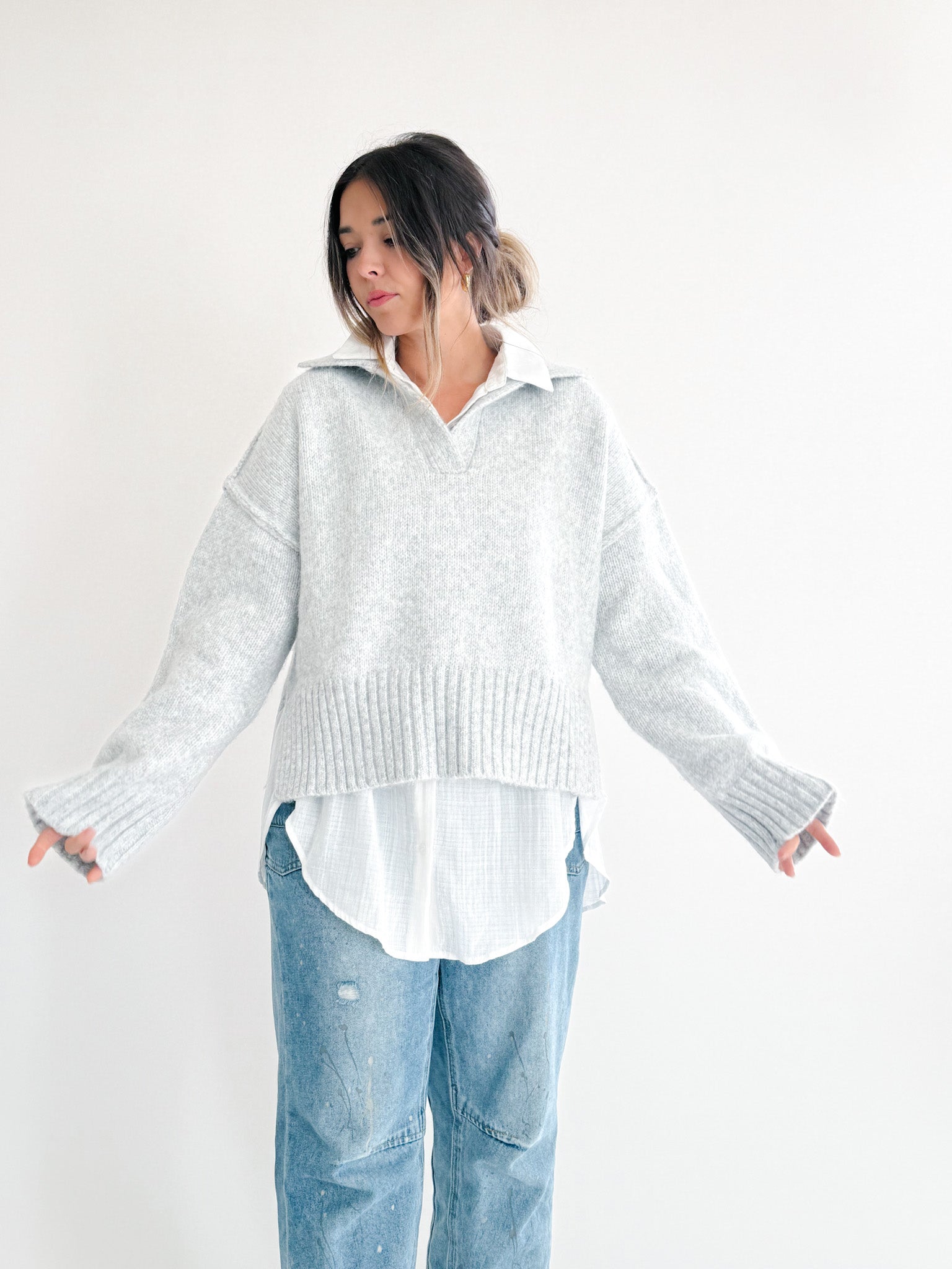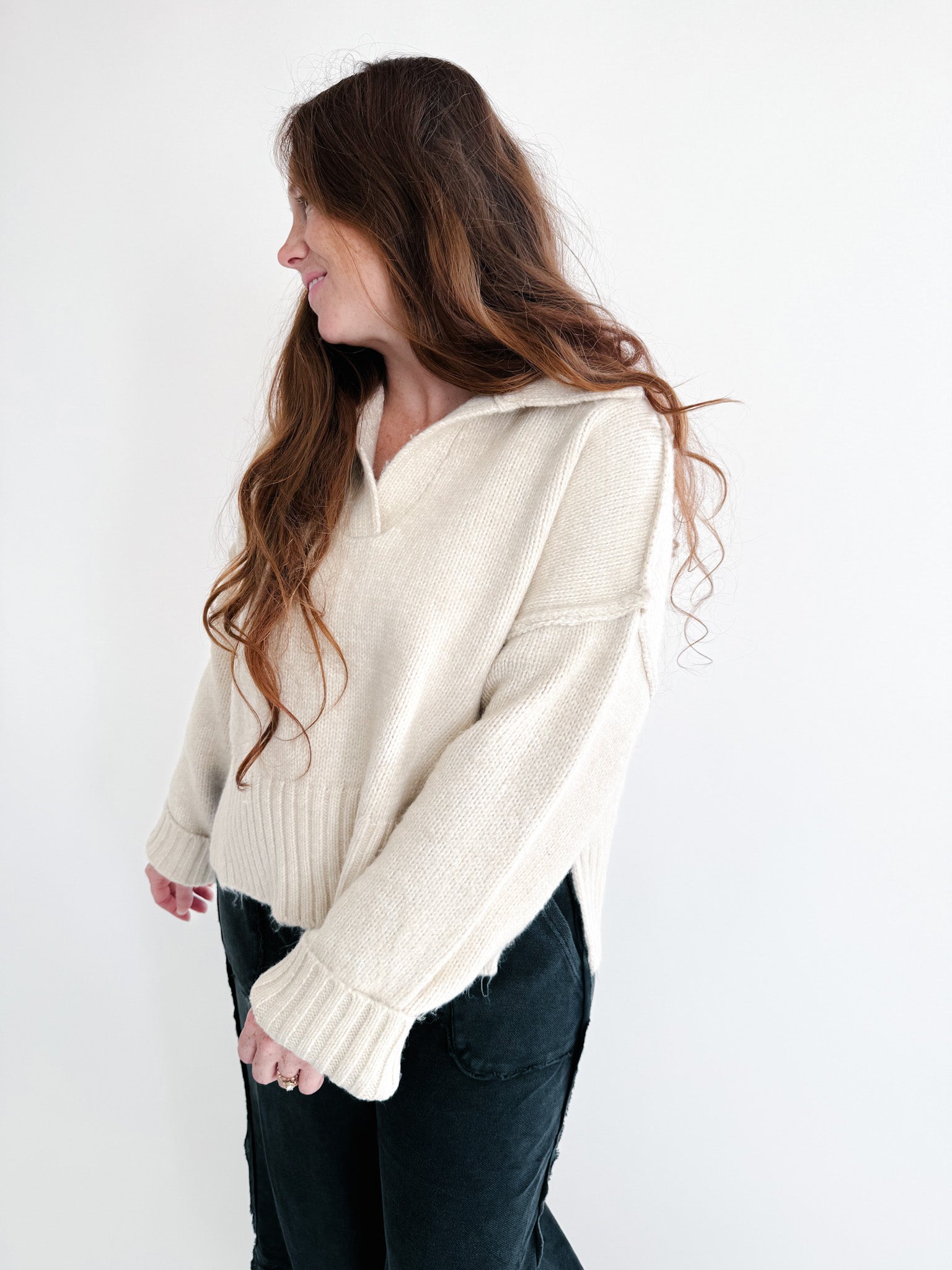 Wrap yourself in cozy elegance with The Classic Sweater. This relaxed-fit sweater features a soft fabric. The oversized silhouette, dropped shoulders, and ribbed accents at the cuffs and hem create a chic, effortless look. A stylish collared V-neckline adds a polished touch, making it perfect for pairing with anything from high-waisted jeans to a playful denim skirt. Whether you're lounging at home or stepping out, this sweater is your go-to for ultimate comfort and style