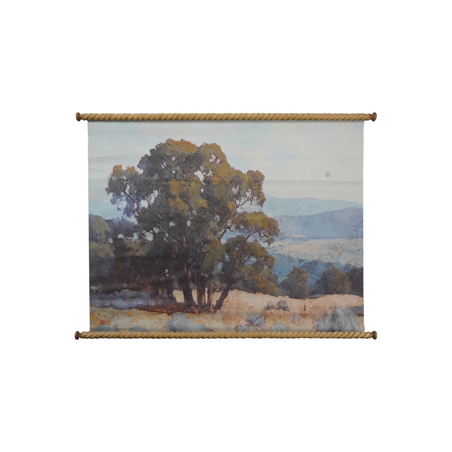 The Quiet Meadow Landscape features a tree as the focal point with mountains and meadows in the background. It has carved wood accents and printed canvas, offering a romantic, old-world take on wall decor. Designed to hang like a vintage textile, it adds softness and visual interest to hallways, bedrooms, or layered gallery walls. Style it alone for a statement piece or pair it with framed art for a collected, European-inspired look.