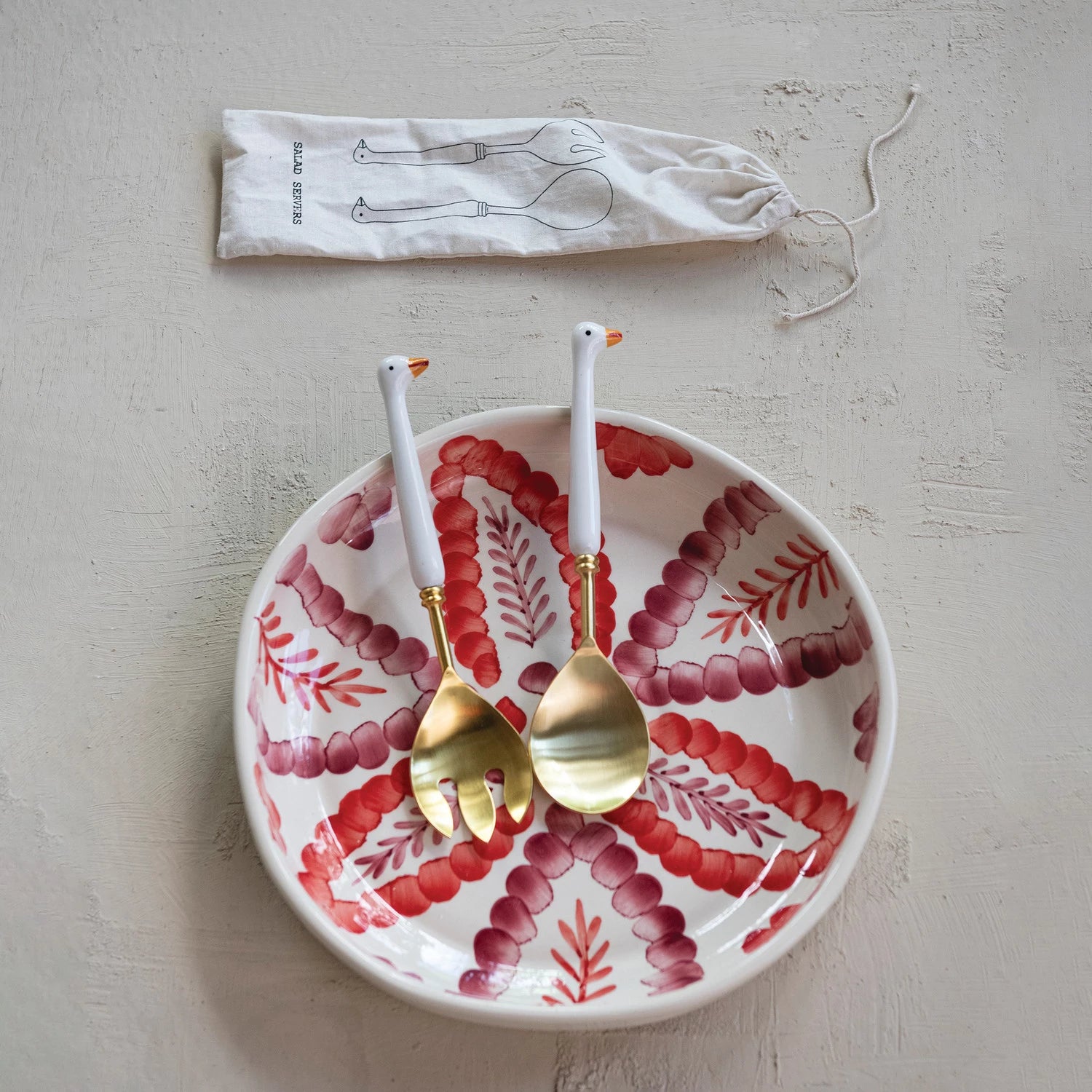 These stainless steel salad servers with aluminum handles feature playful goose-shaped handles that bring a touch of charm and personality to the table. Both functional and decorative, they’re perfect for serving salads, pasta, or shared dishes during everyday meals or casual gatherings. Display them in a serving bowl or utensil crock when not in use for a collected, lived-in look that adds character to your kitchen or dining space.