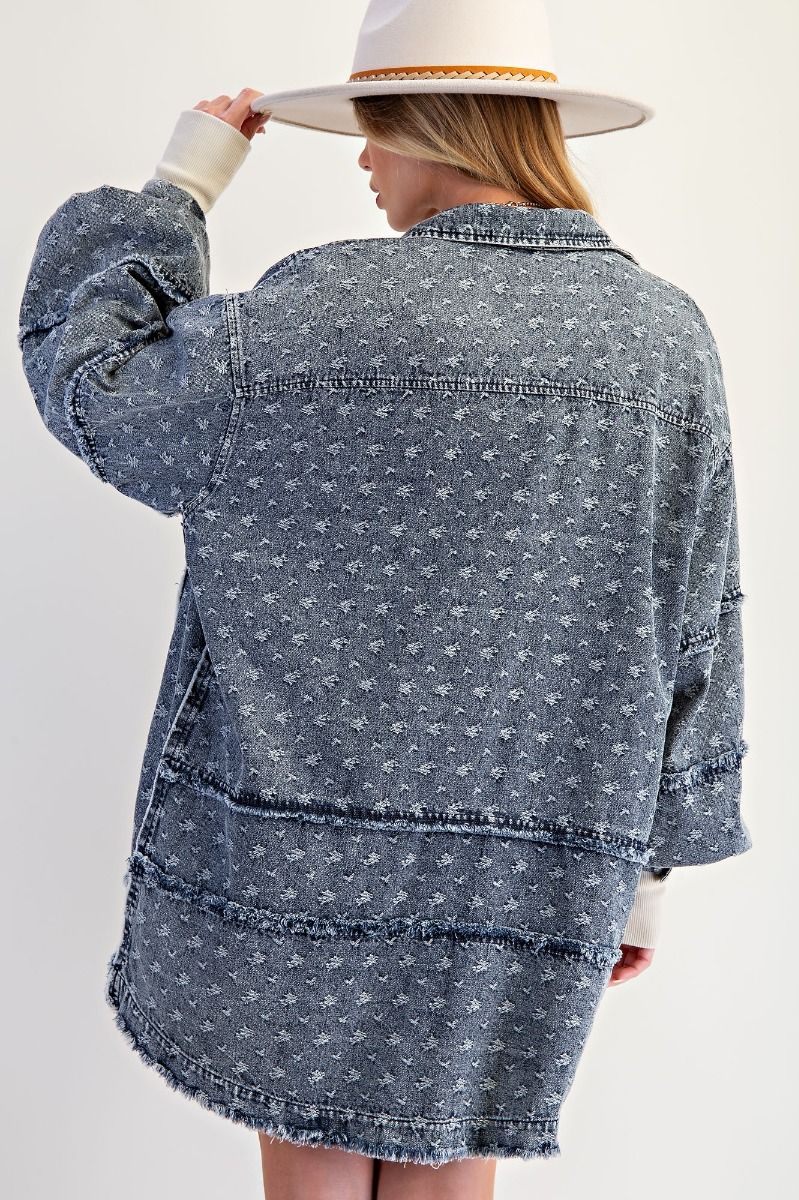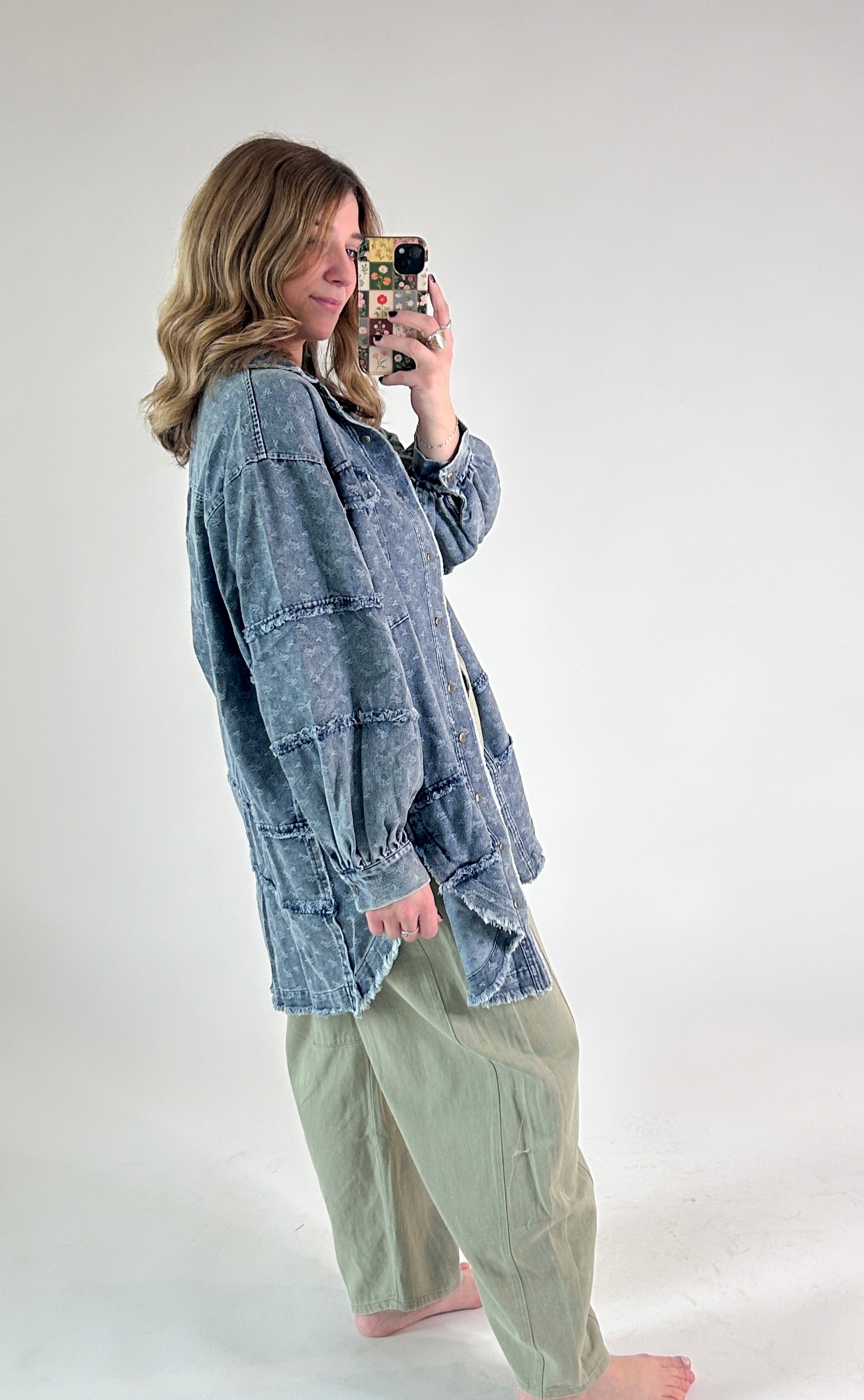 This textured washed denim button-down tunic features delicate mini floral embroidery, raw-edged seams, and relaxed drop shoulders with soft puff sleeves for an effortlessly lived-in feel. Designed with an oversized fit and curved raw hem, it styles beautifully worn loose as a tunic, half-tucked into denim, or layered over a tank with pants or shorts, making it an easy, character-rich piece for everyday wear.