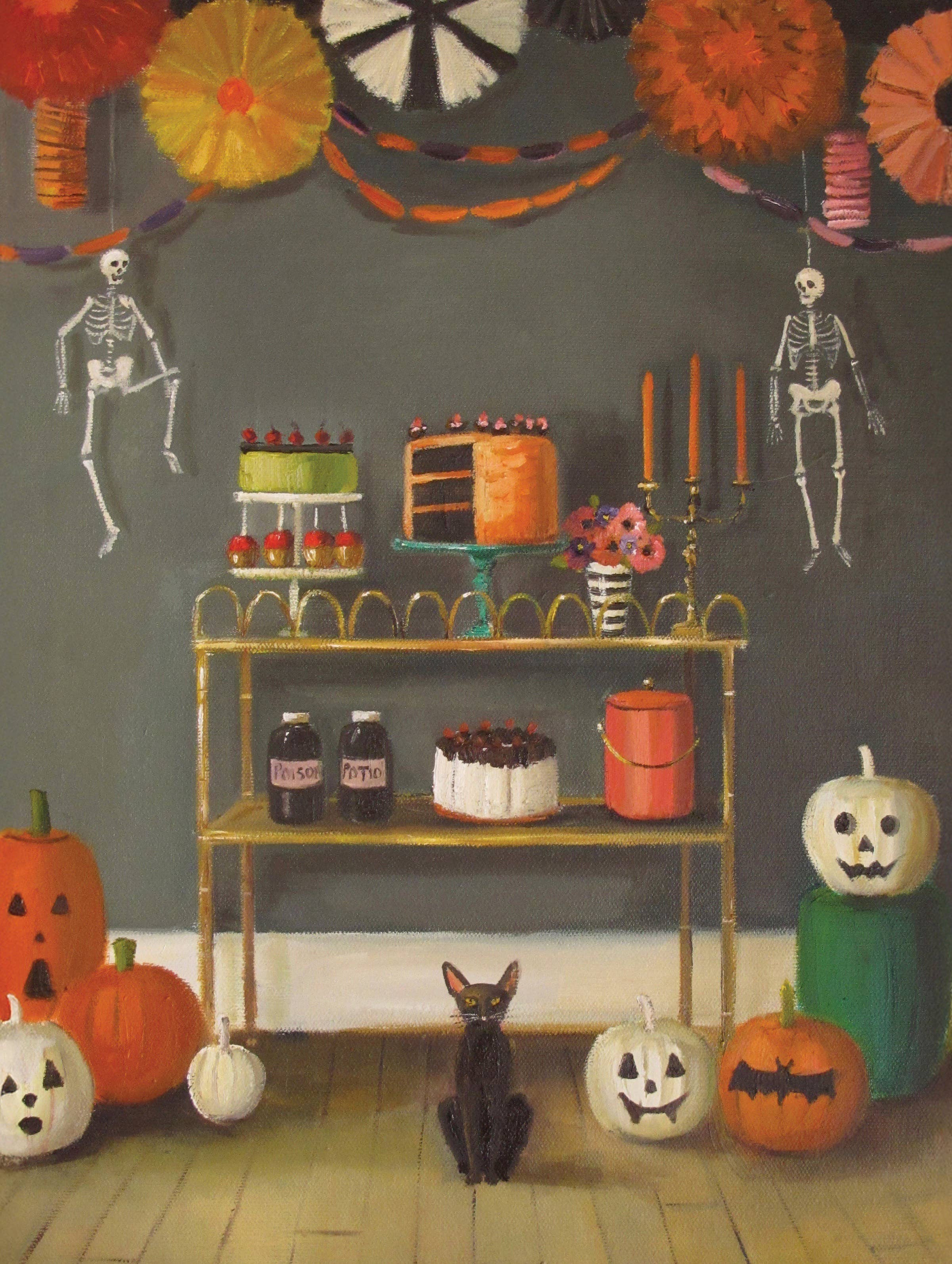 At the heart of the scene is a narrow table adorned with an irresistible spread of Halloween treats—cakes, pastries, and festive sweets all perfectly arranged for ghostly guests. The space is decorated with care, from colorful jack-o'-lanterns glowing on the floor to playful skeletons grinning from the walls. A small black cat sits front and center, keeping a watchful eye as the unofficial guardian of the celebration.