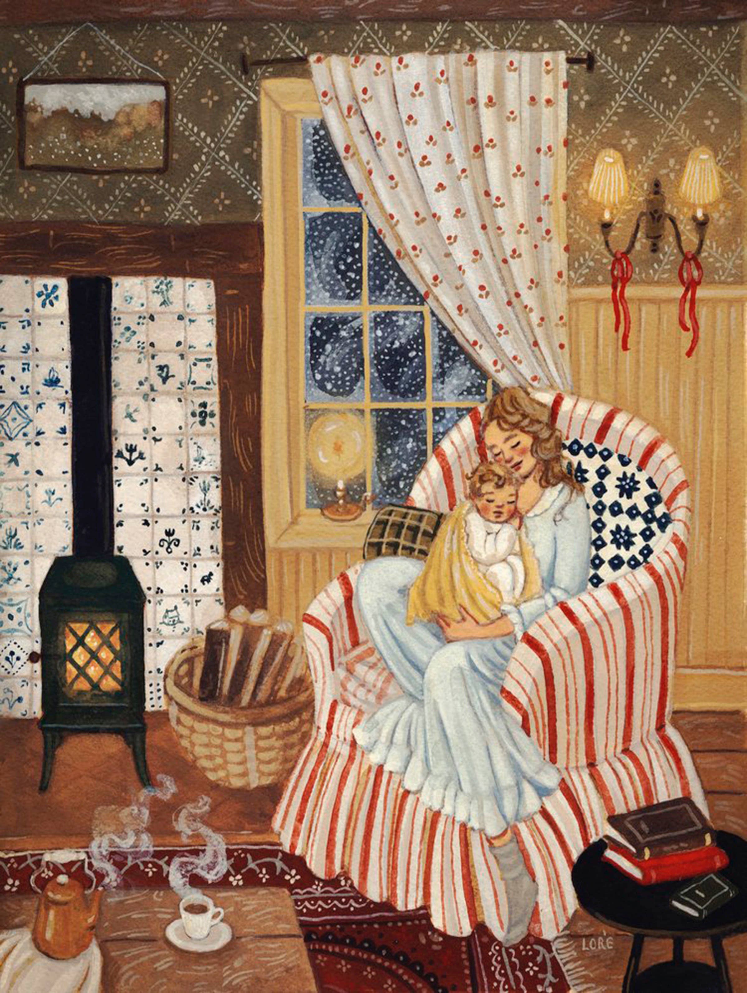 Wrap yourself in the warmth of a quiet winter night with Held, a 500 piece jigsaw puzzle by beloved New England artist Loré Pemberton. This tender, intimate scene captures a young mother cradling her infant in the soft glow of a cozy cottage, offering a serene moment of comfort, love, and connection. Inside, the woodstove glows with gentle warmth, casting a golden light across the room. Candles flicker and a fresh kettle of tea sits ready, adding to the peaceful, homey atmosphere. Outside, snow falls softly, blanketing the night in calm and quiet—a perfect contrast to the snug world within. Held beautifully reflects Loré Pemberton’s signature style: timeless, heartfelt, and deeply nostalgic. With its soothing winter palette and emotionally rich storytelling, this 500-piece puzzle invites puzzlers into a world of quiet magic and maternal love. Ideal for the holiday season or cozy nights at home, it’s a meaningful gift and a comforting escape.
