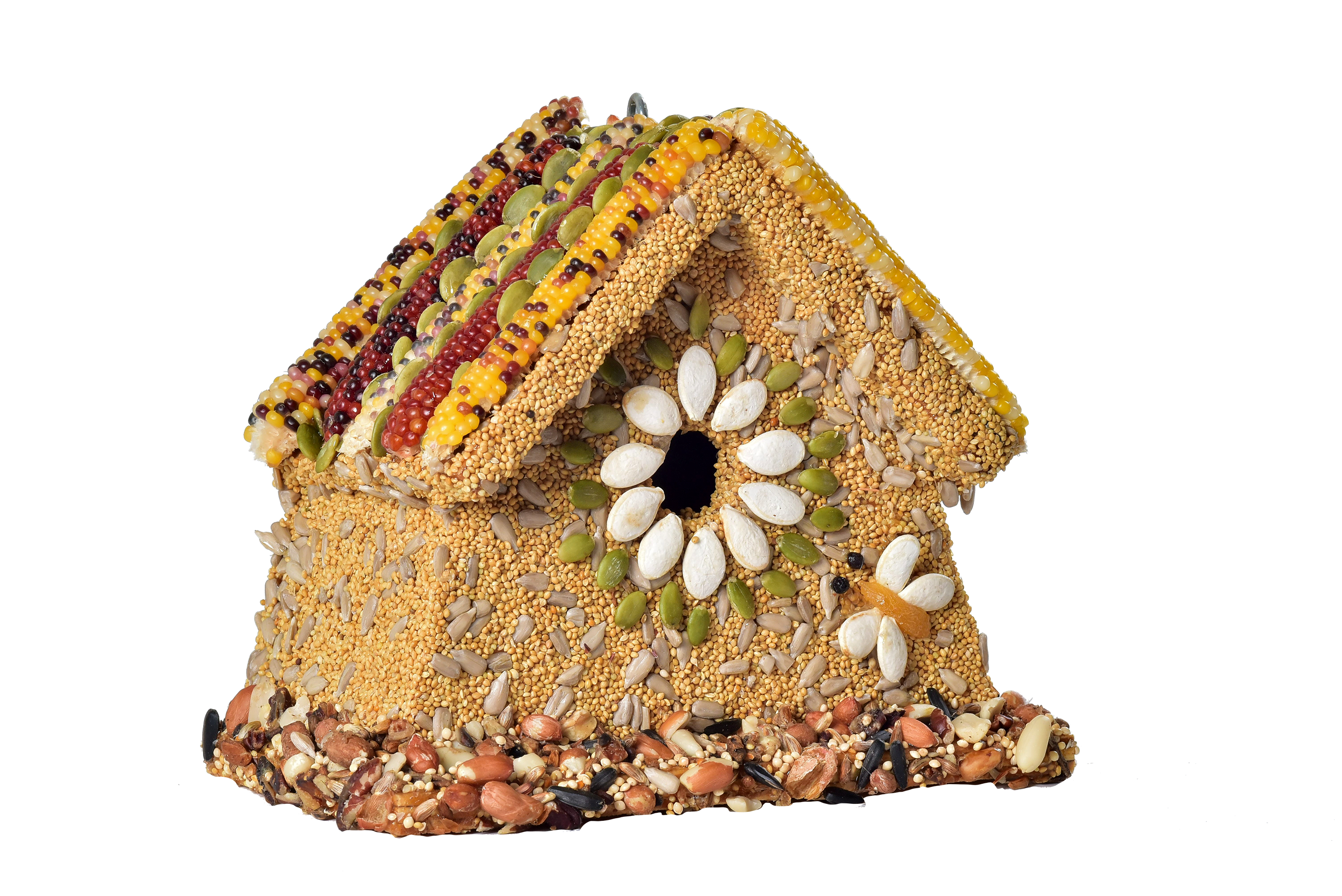 Delicious and delectable premium birdseed, nuts, and Indian corn coat this durable wooden bird house. Once the seed is consumed the birds may nest in this house for many seasons to come.