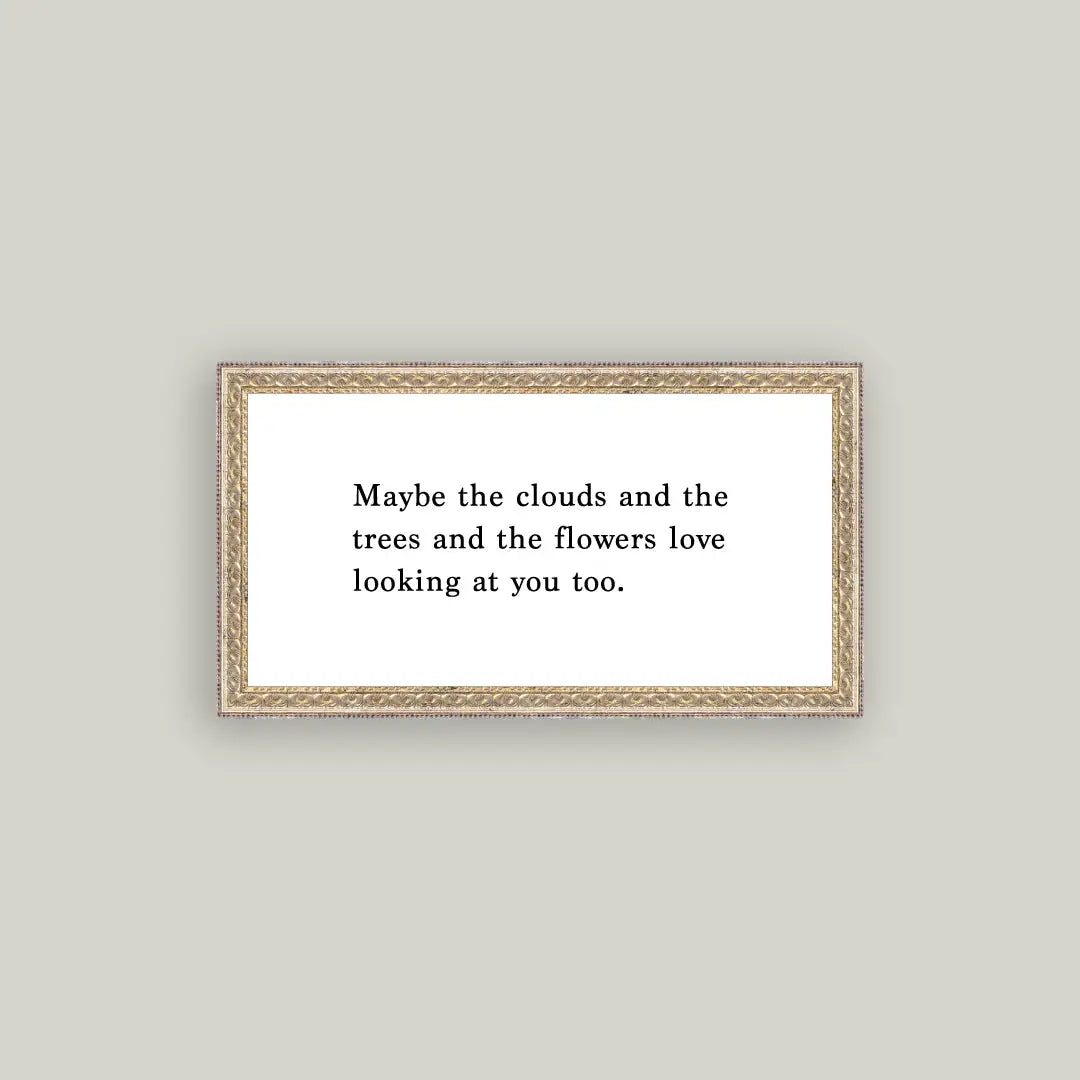 Maybe the clouds and the trees and the flowers love looking at you too. We think they do! This art is printed on raw canvas and placed in an antique frame for an authentic, timeless look. Looks stunning in a small wall space, on a shelf or ledge, or as a part of a gallery wall.