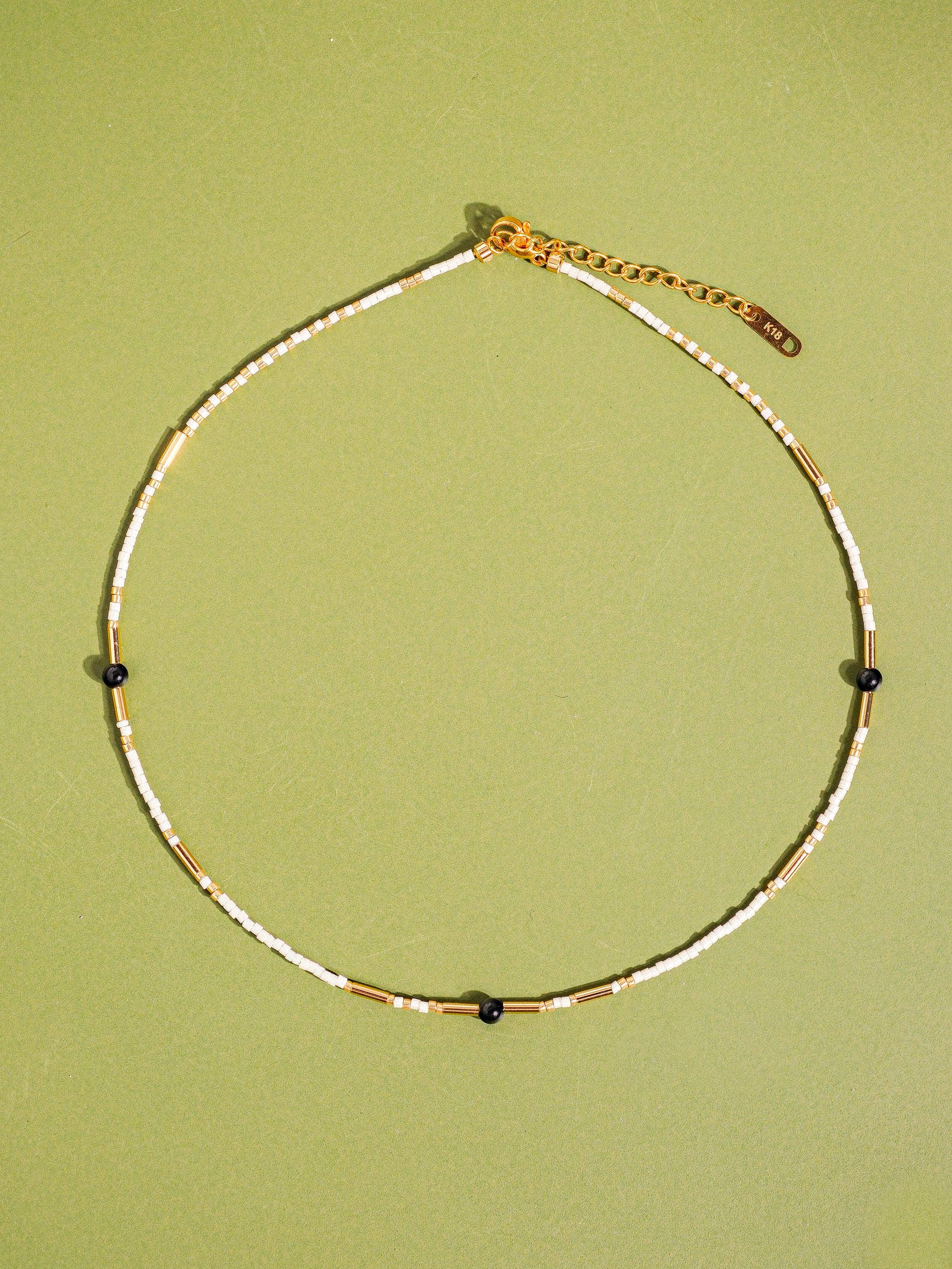 Nadine blends black, white, and gold-toned beads in a handmade design that feels bold yet balanced. Finished with warm gold accents, it’s an effortless piece that adds quiet contrast to everyday wear.