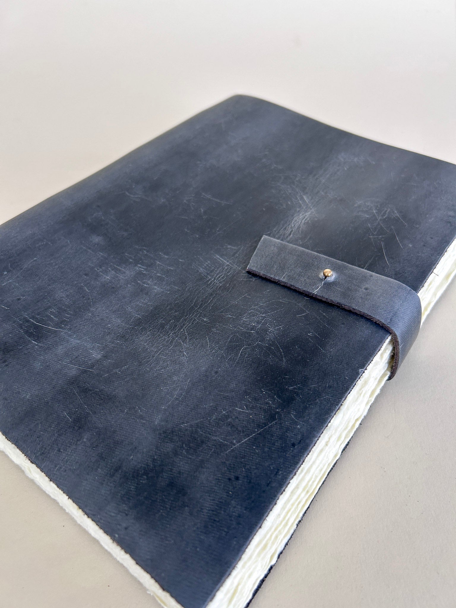 Pages are made from handmade cotton paper with deckle edges. The paper is unlined and perfect for notes, sketches, or watercolor. The leather exterior is soft with light scratches and beautifully worn... it will only become more beautiful with age.