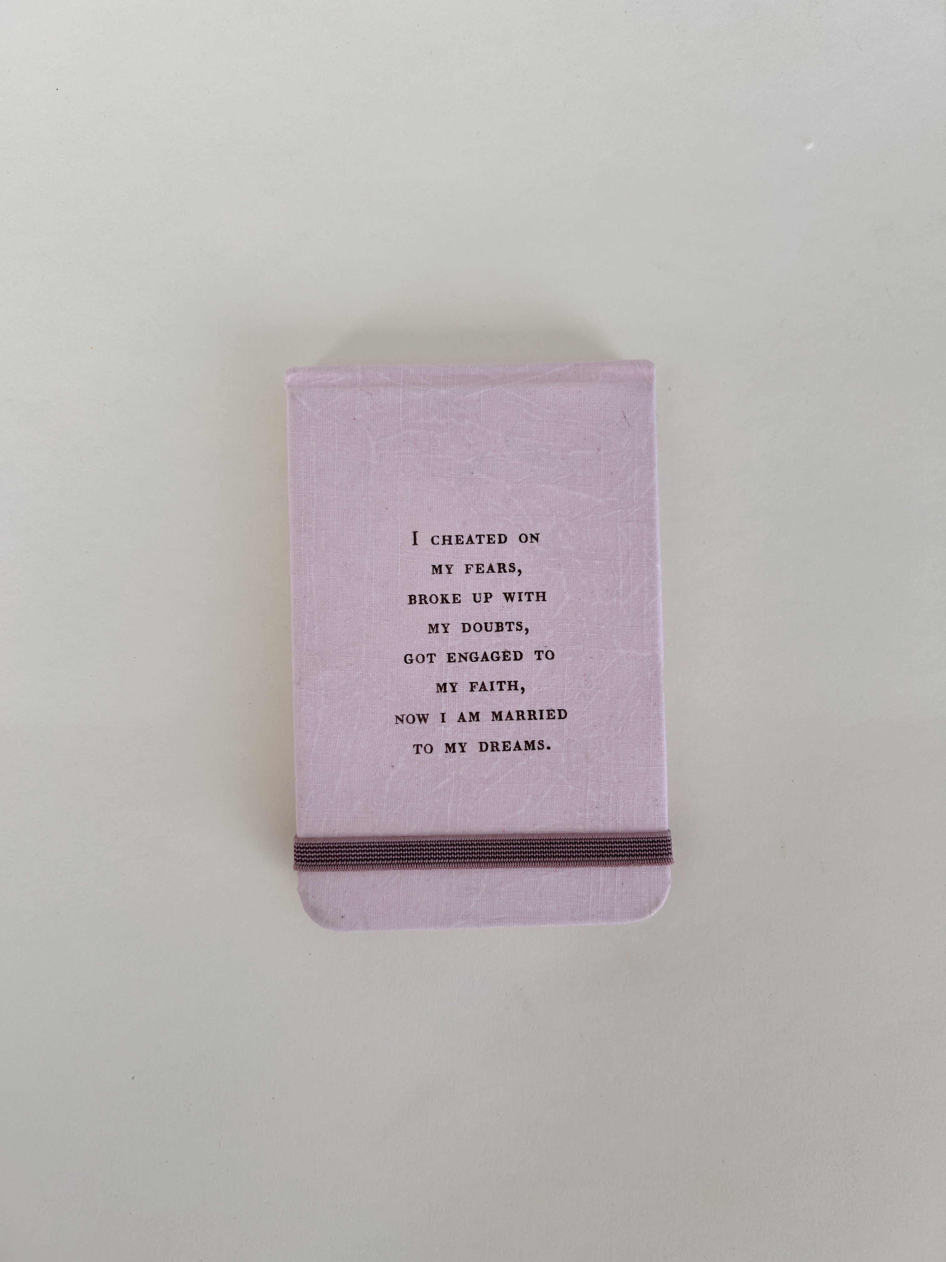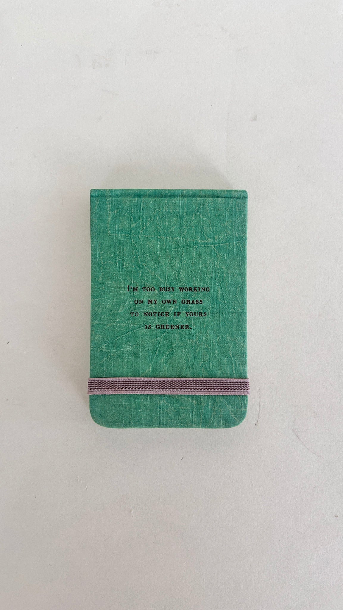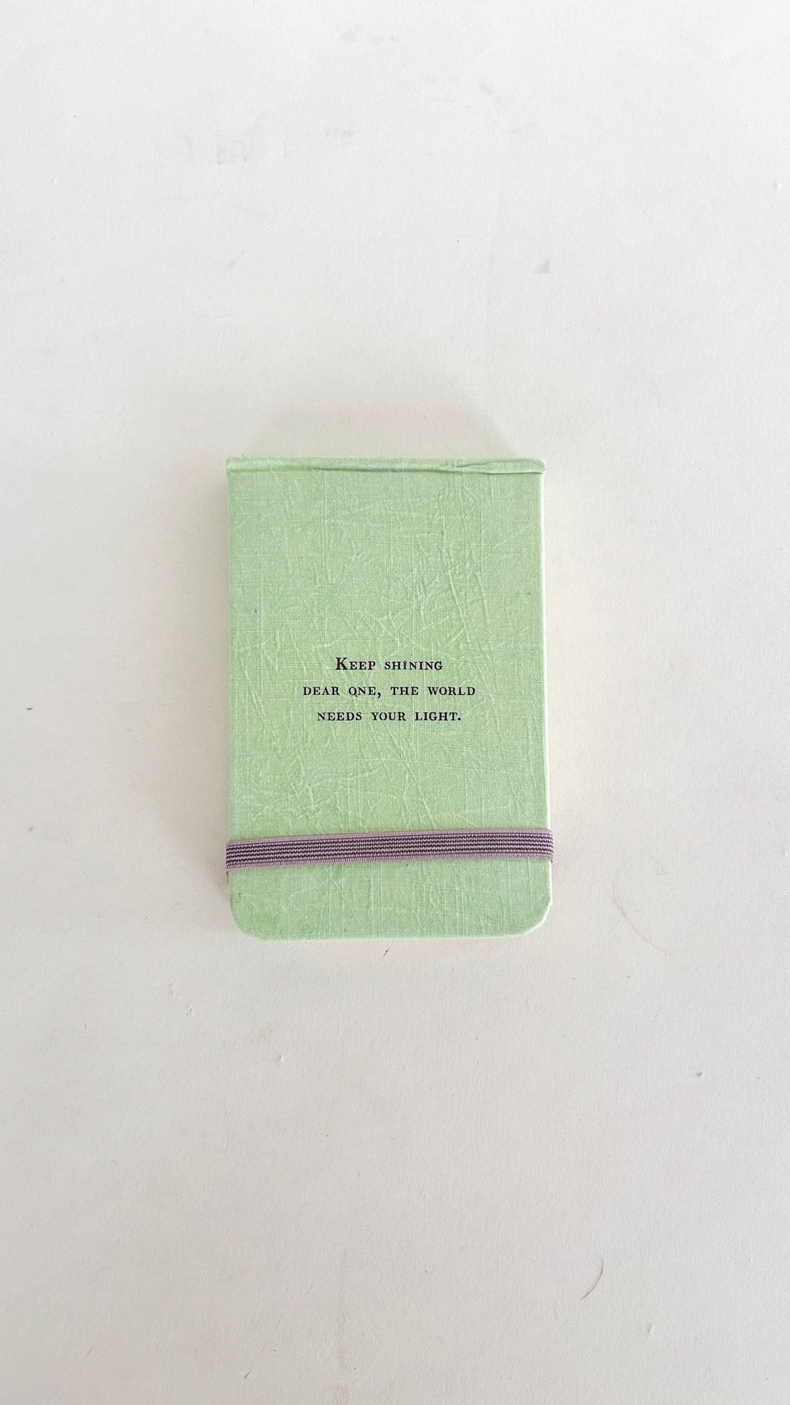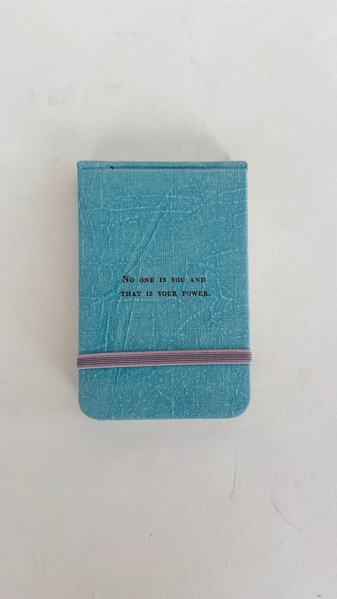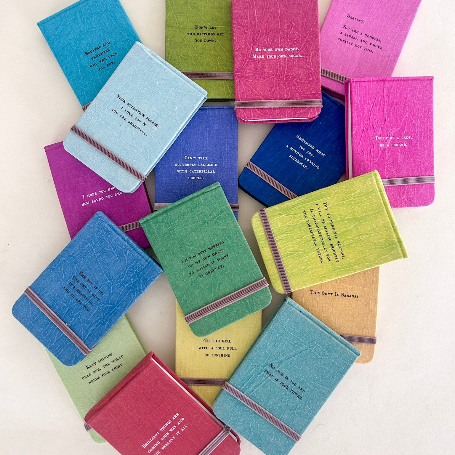 These pocket-sized notebooks are full of color and possibility. Unlined pages invite free thinking, each cover carries a different quote or phrase, and an elastic strap keeps everything together.