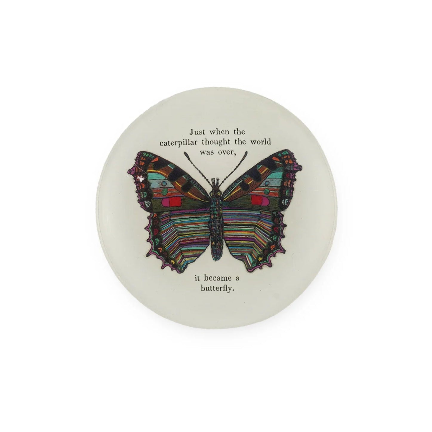 Small in size but big on charm, our Mini Round Decoupage Plate is a tiny treasure with a lot to say. Whether it’s a tender quote, a whimsical illustration, or a gentle reminder to dream bigger, each plate is a little love note for your everyday moments. Made with glass and original art by Rebecca Puig (art reprinted into tray). The bottom of the tray is gold foil.