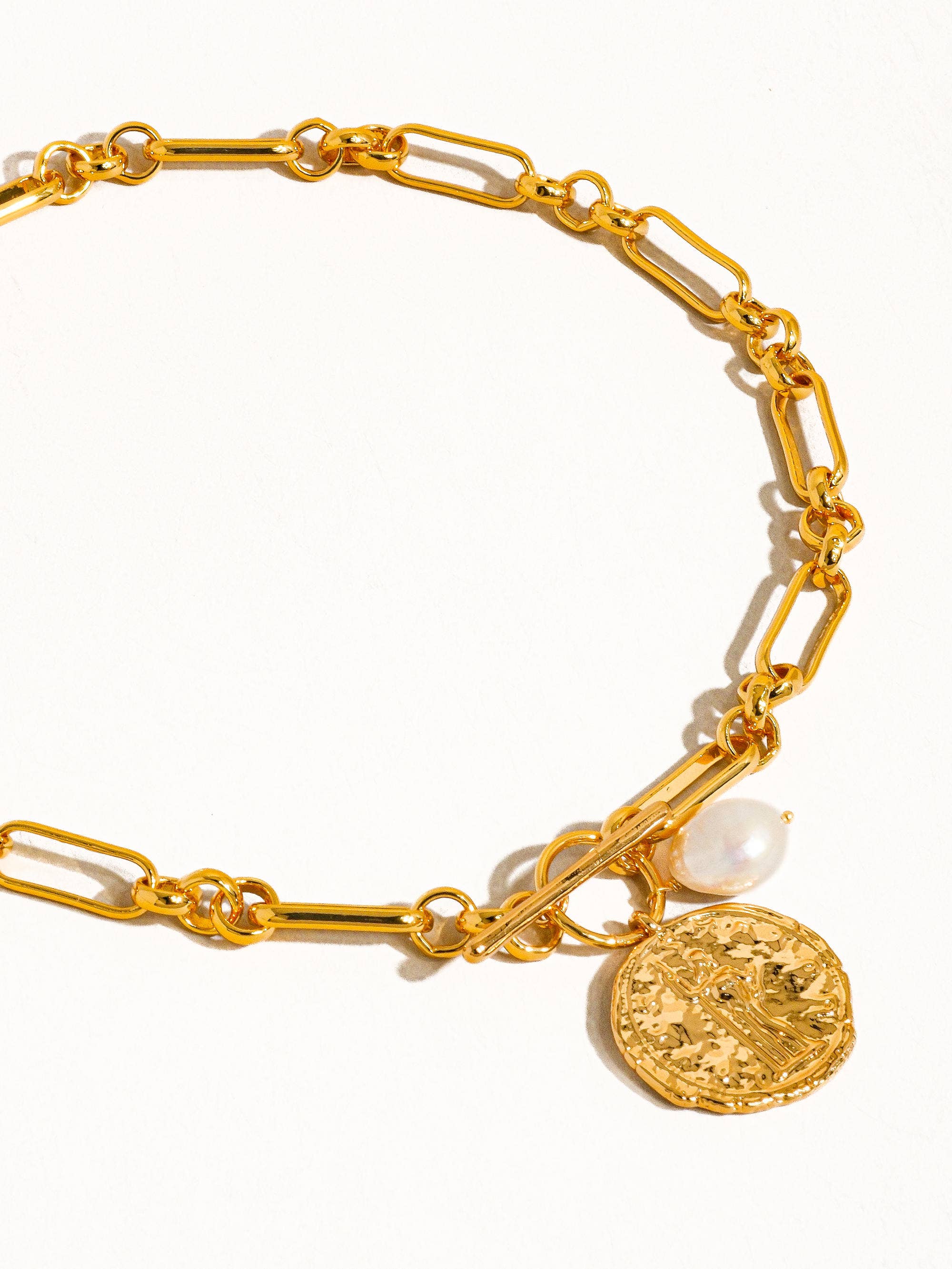 Thalia pairs a bold coin pendant with the organic beauty of a baroque pearl, creating a piece that feels timeless and collected. Finished in warm 18K gold plating, it brings quiet richness to everyday layers.
