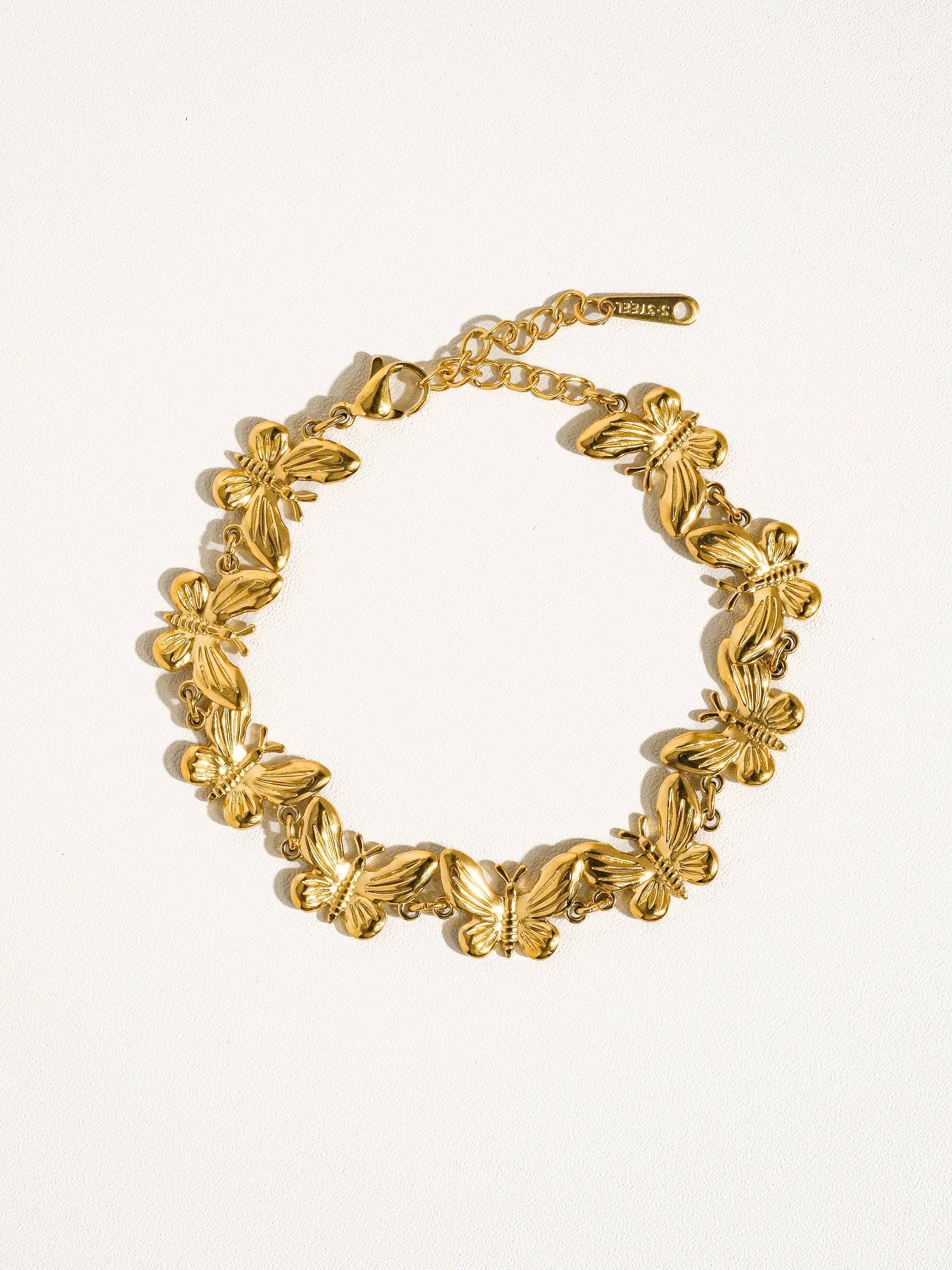 Seraphine features a delicate butterfly detail along a fine gold chain, symbolizing quiet transformation. Finished in non-tarnish 18K gold plating, it’s an effortless bracelet for everyday softness and shine.