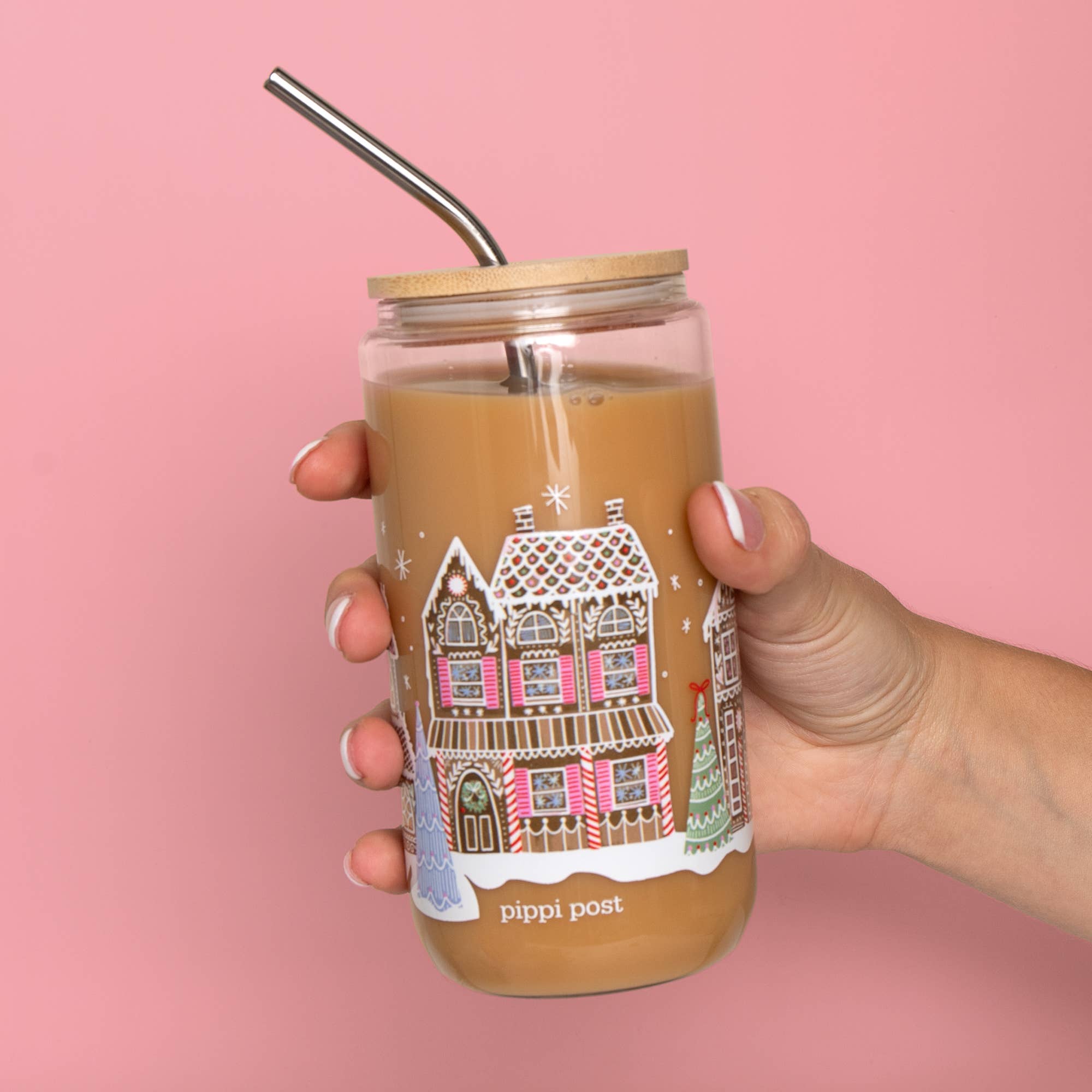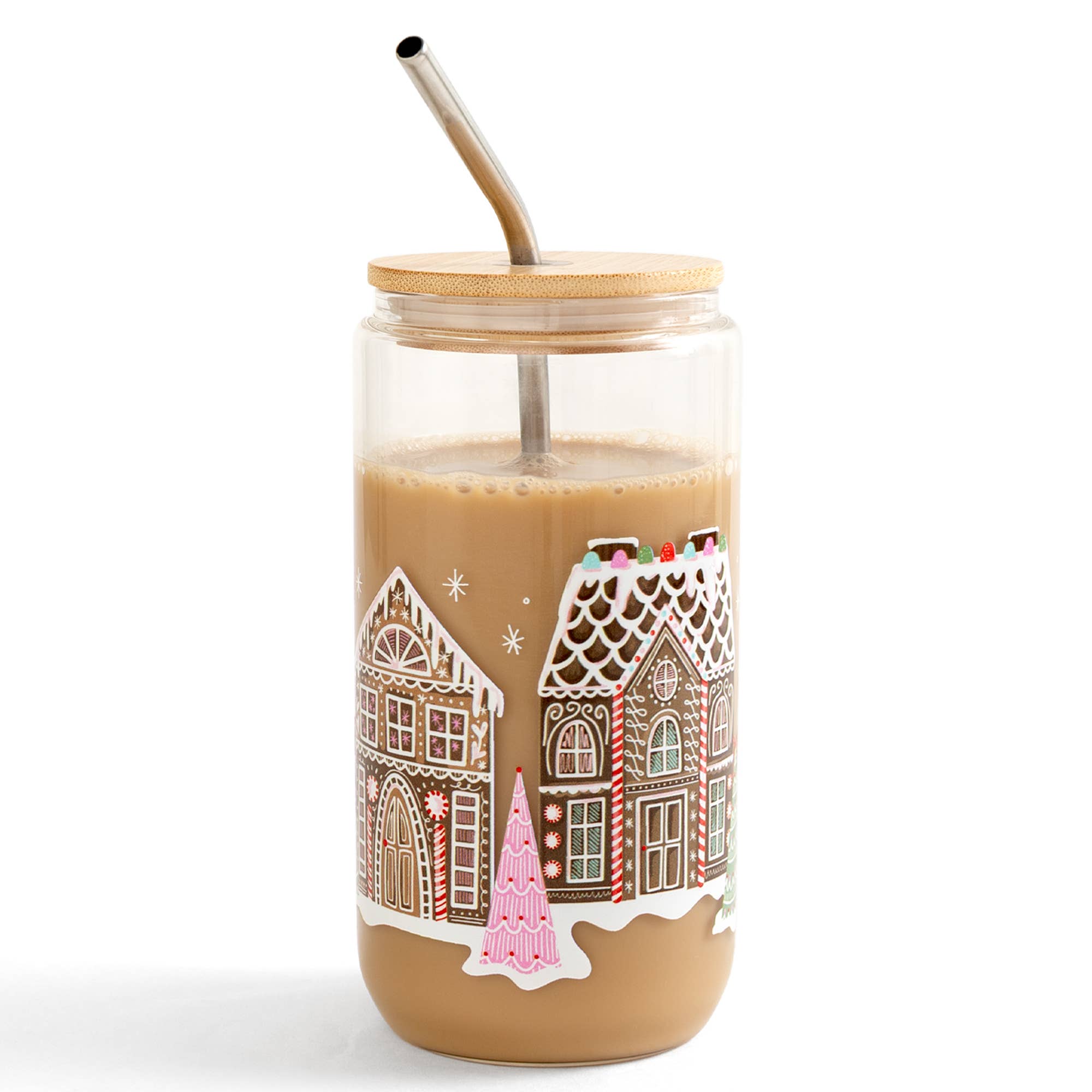 Enjoy a cozy winter scene with the Gingerbread Village glass cup! Adorned with charming gingerbread houses, snowy rooftops, candy canes, and festive Christmas trees, this cup is ideal for your favorite holiday drinks. It comes with a bamboo lid and a reusable stainless steel straw, making it a delightful part of your seasonal celebrations.