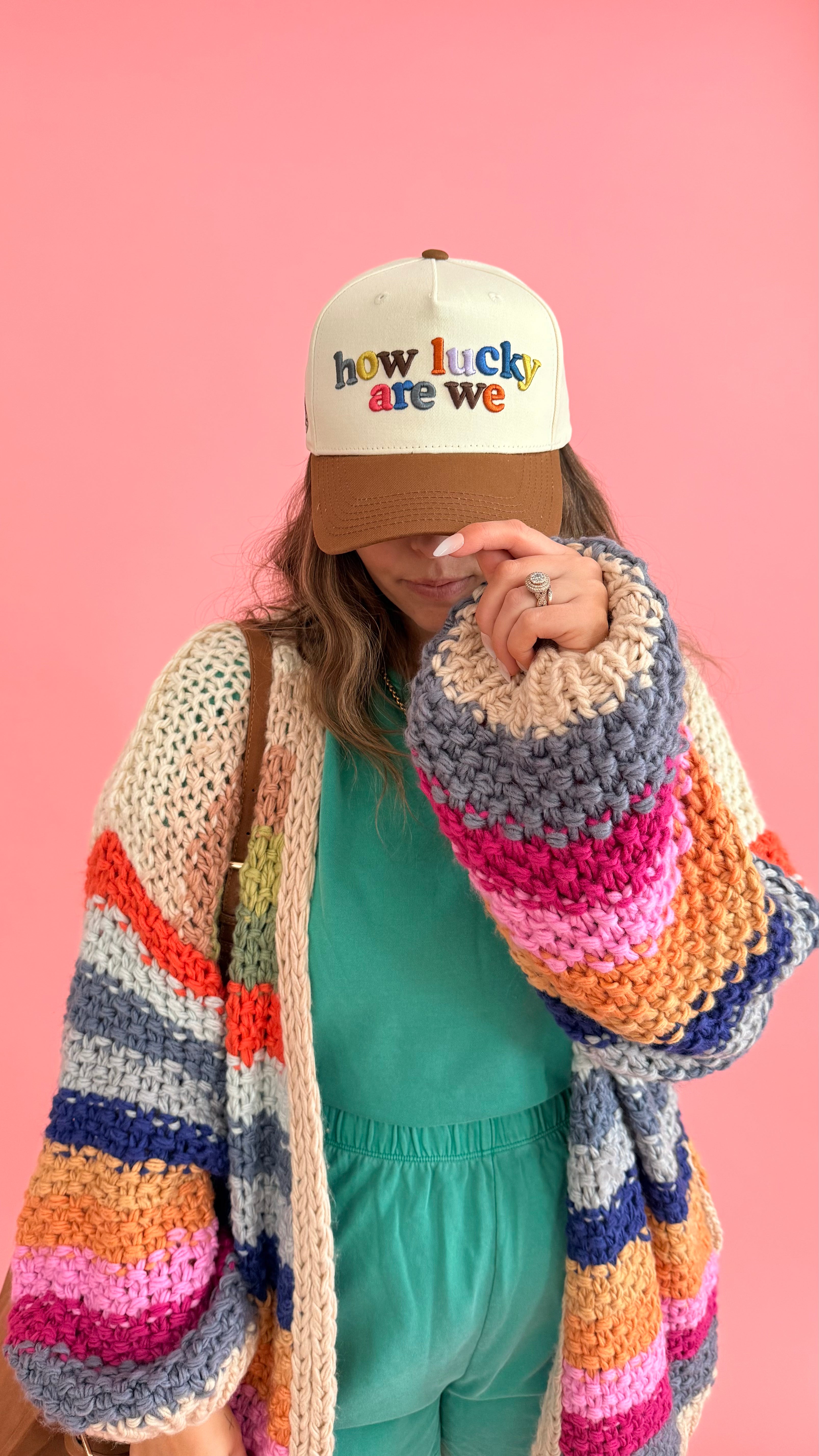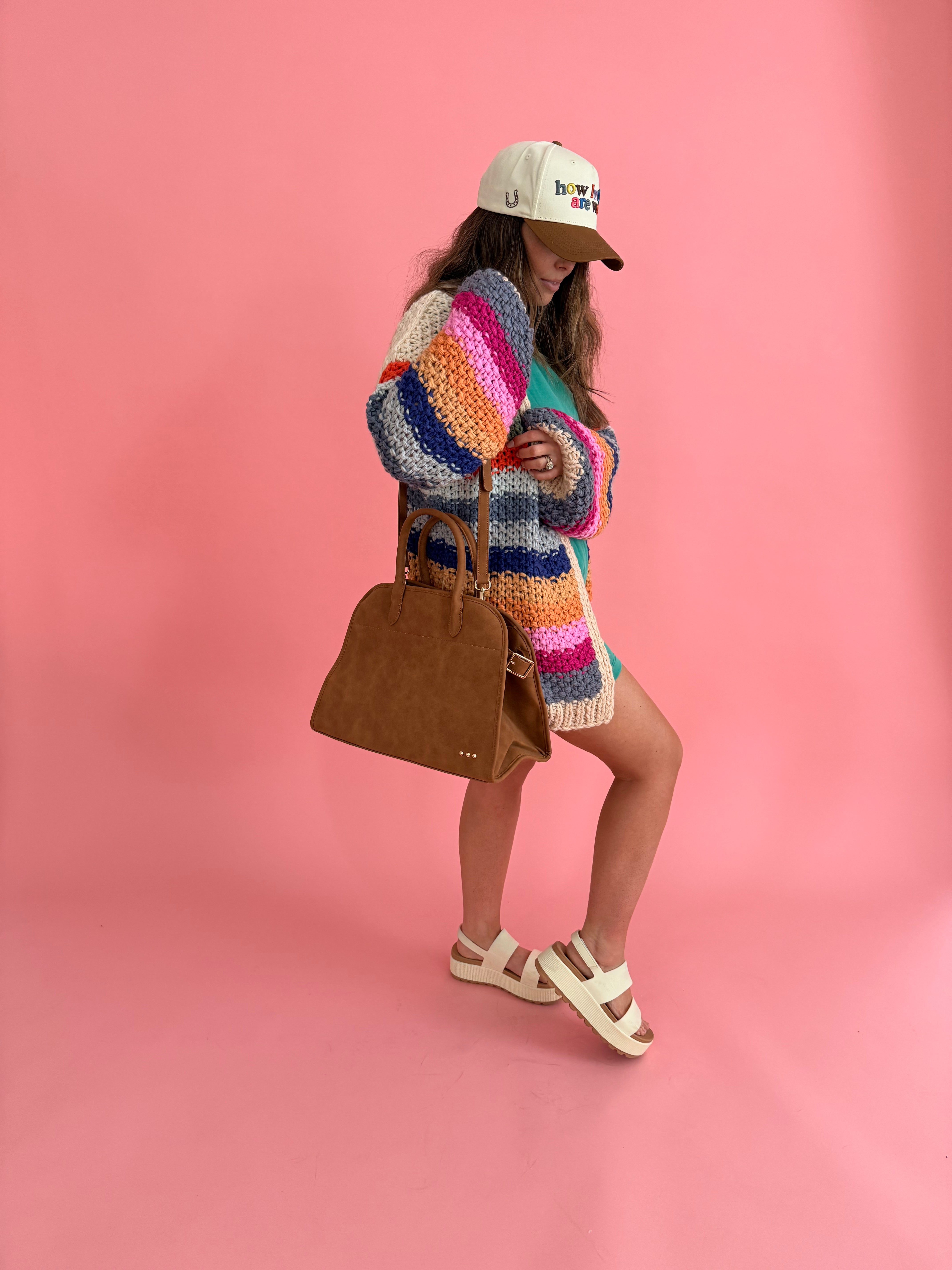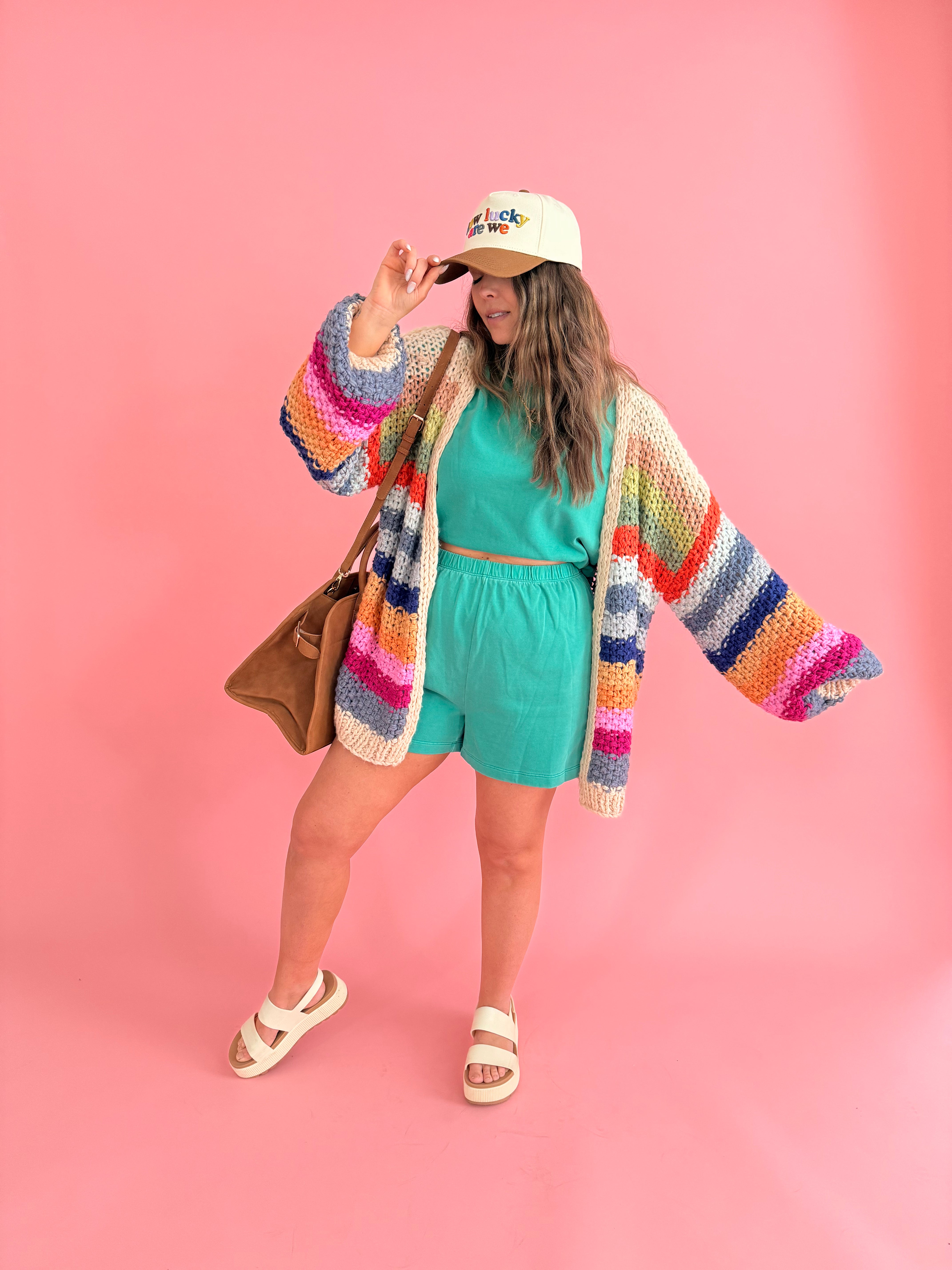 Hand-crocheted with thick, rainbow-hued yarn, this open cardigan feels like a wearable hug. Yes, it has pockets! The relaxed drape and oversized sleeves give it that effortlessly cozy look, while the chunky texture adds just the right amount of warmth. Ribbed edges keep the shape feeling intentional, and side pockets make it as practical as it is charming. Throw it on over a simple tee and your favorite denim for an easy, feel-good everyday outfit. Layer it with a flowy dress or midi skirt and boots to let the colors pop while keeping things cozy.