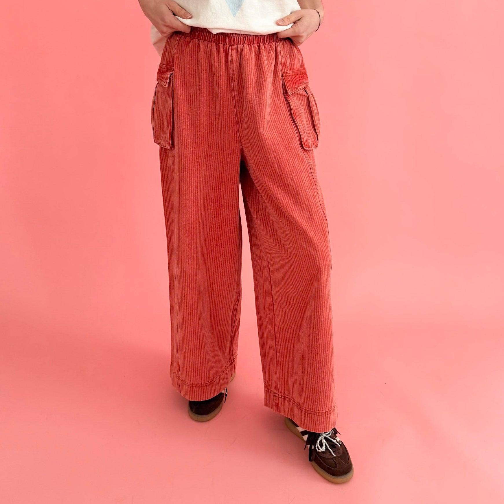These mineral-washed wide leg beauties bring all the boho energy with their soft stripe texture, relaxed fit, and perfectly slouchy cargo pockets. The elastic high waist keeps things comfy while still giving you that laid-back, lived-in vibe. Style with a band tee and sandals, or throw on a cropped tee and sneakers for everyday cool look. Add a chunky sweater when the temps drop - these are year-round kind of pants.