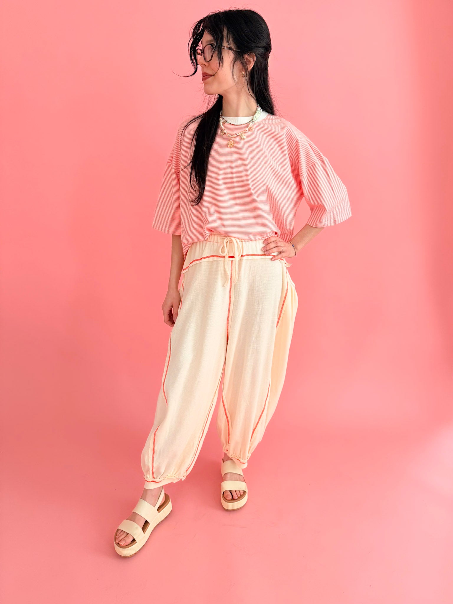 These relaxed fit pants bring serious rhythm with their mix of thermal and ribbed textures, finished with bold overlock stitch details that feel straight out of a hip hop playlist. The pointed paneling and soft, slouchy shape give them that effortless “just threw these on but look amazing” vibe, while the elastic waist and drawstring keep things comfy all day long. Style them with a cropped tee, oversized sweatshirt, or fitted tank and chunky sandals for a look that feels playful, a little retro, and ready to move - whether you’re dancing in the kitchen or heading out for coffee.