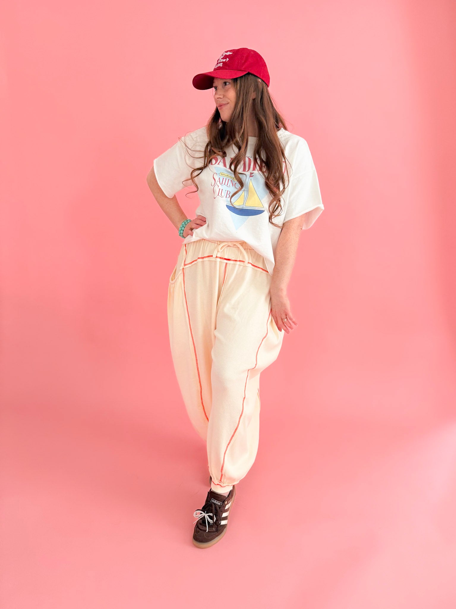 Fit Notes: These are meant to look oversized but also run oversized and have stretch in the waist that can be tightened. So comfy! Hollee (red hair) is typically a size 8/10 and is wearing Medium. Addi (dark hair) is typically a size 0 and is wearing a Small.