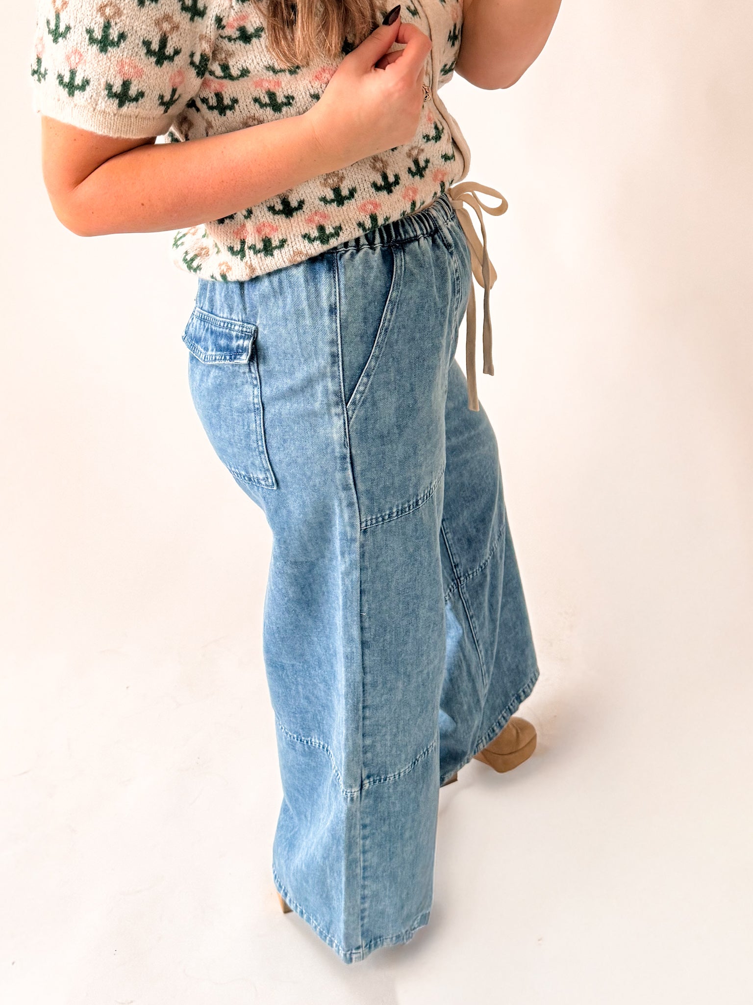 Relaxed wide-leg denim pants with an adjustable drawstring waist and oversized pockets. Crafted from soft, washed denim with contrast stitching details, these pants offer comfortable movement and a modern silhouette. Style with a fitted ribbed tank or an easy graphic tee. Add a lightweight cardigan or cropped jacket for layering. They look especially good with a cozy knit sweater and boots in colder months or paired with a simple linen button-down and sneakers for an effortless everyday look.