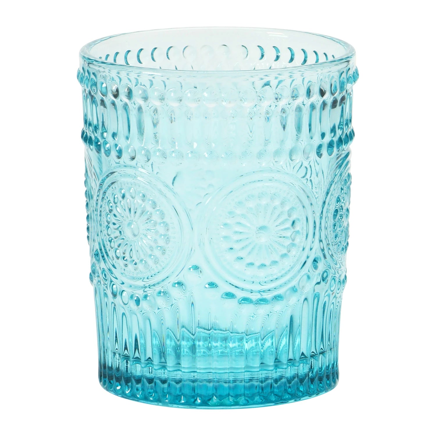 Sold Individually...An embossed glass tumbler with soft color and vintage-inspired texture designed for everyday use or simple display. Style it layered into your table setting, paired with mixed glassware, or used to hold small stems for an easy gathered look.