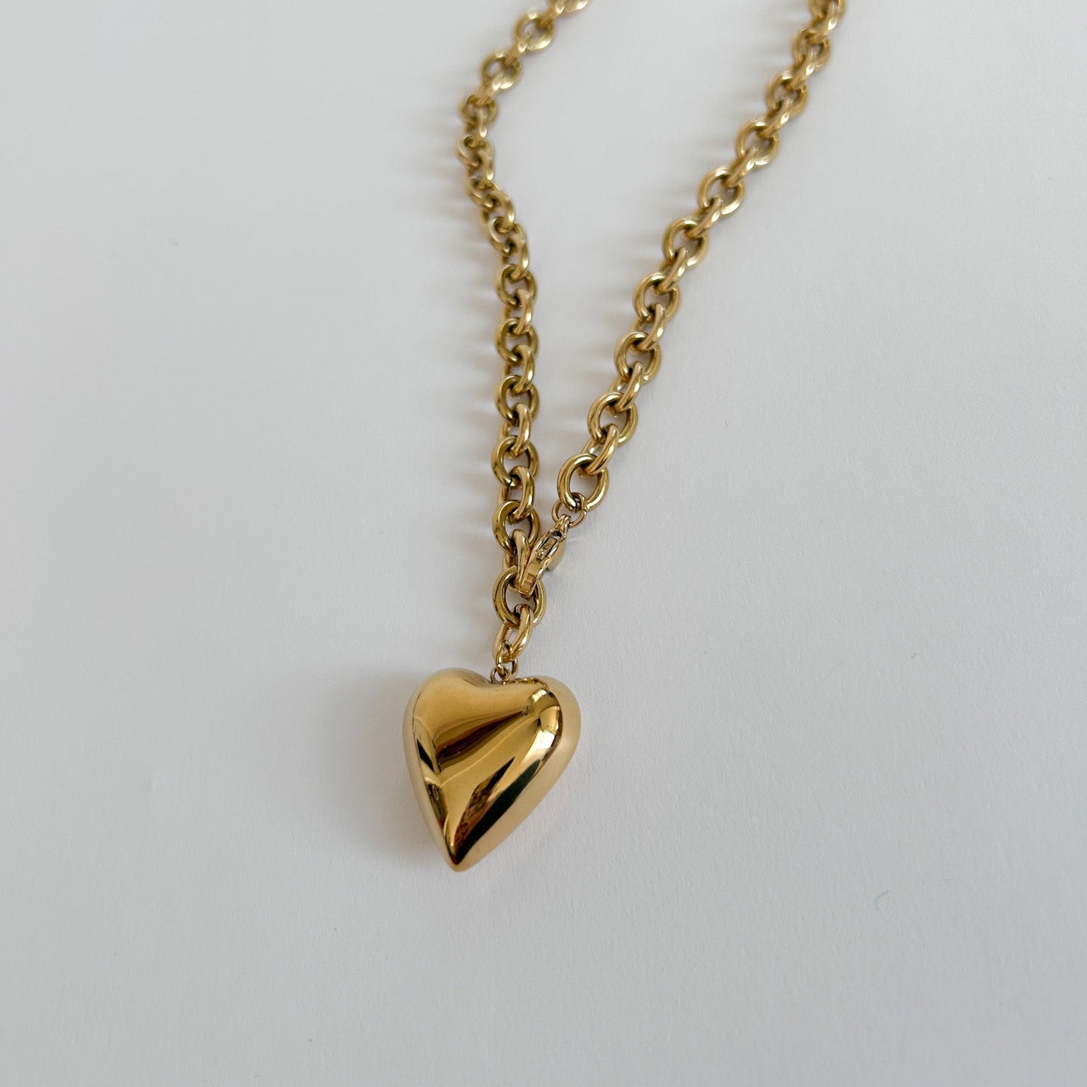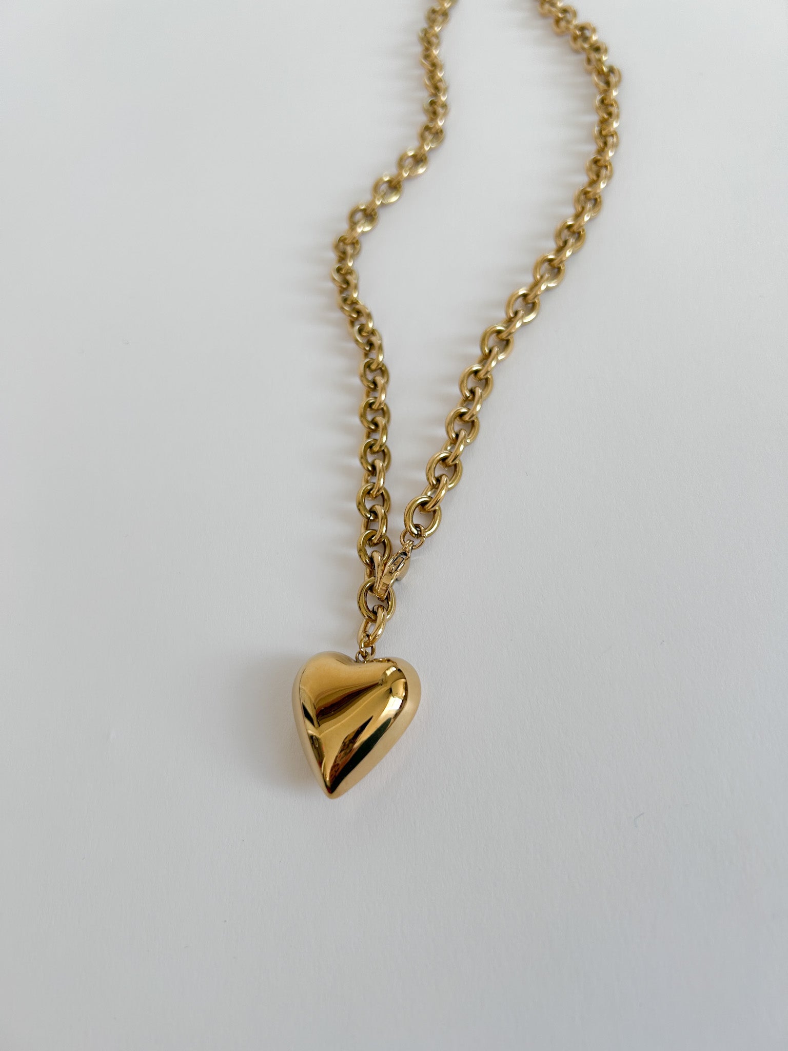 Our Solid heart necklace is a great layering piece or a beautiful statement item, it interlocks in the front for easy put on. This piece adds the perfect touch to your outfit whether you add it to your favorite dress or lounge outfit this piece is for you! The clasp can be connected anywhere to create a necklace or choker with chain drop moment!