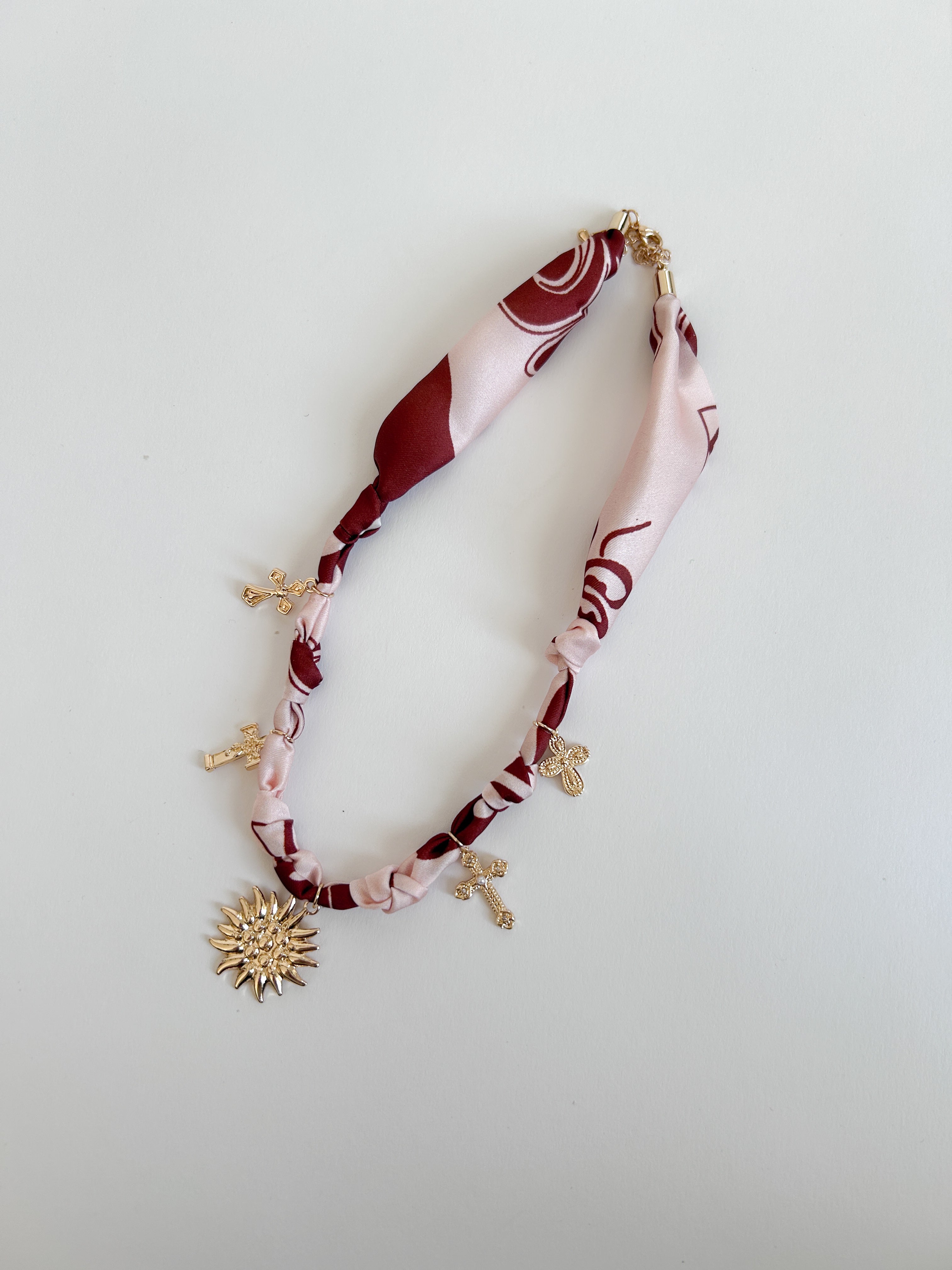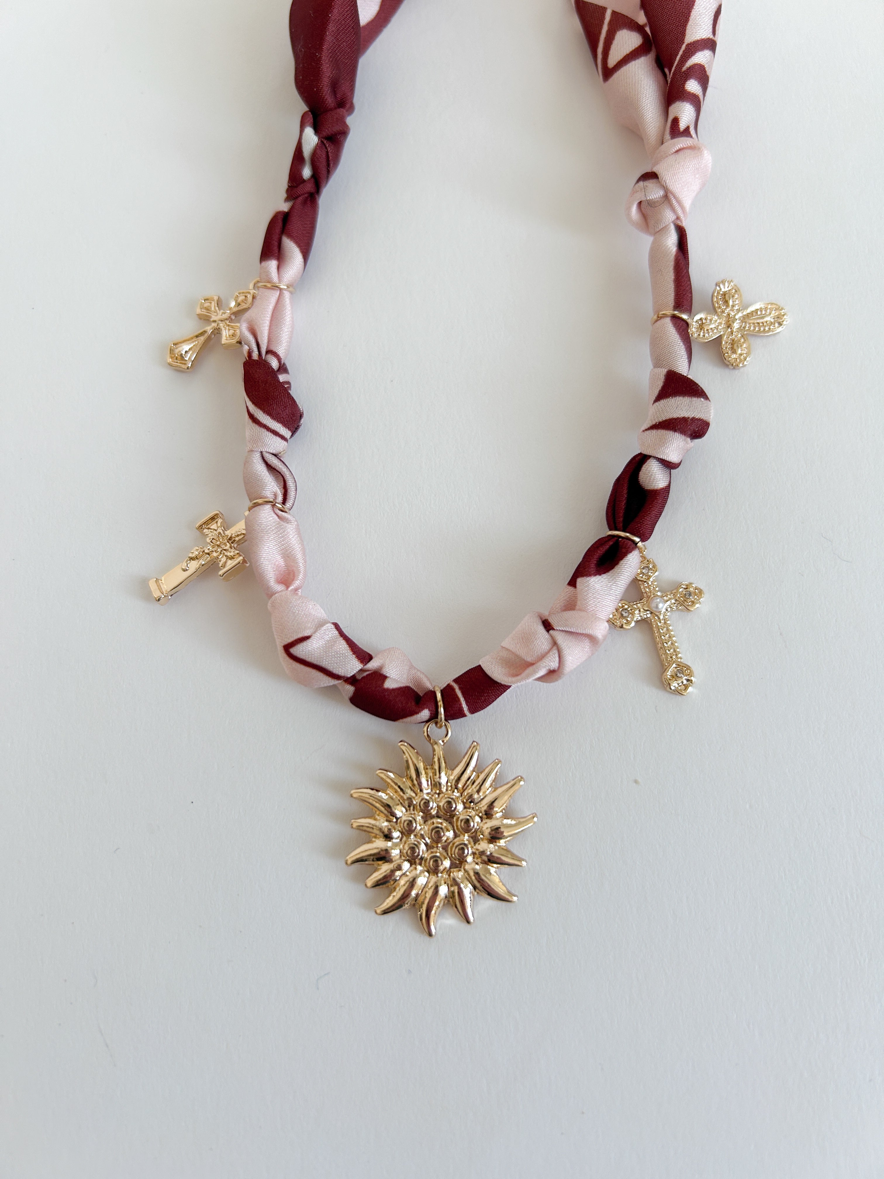 Add a little pizazz to your fit with our Desert Love Necklace 😍 We love the fun mix of the elevated silk scarf used - but then knotted and fun charms added. It blends polish and personality. Wear it solo with a neutral outfit for it to make a statement or layer it up with other jewelry and a fun outfit for an over the top boho look.