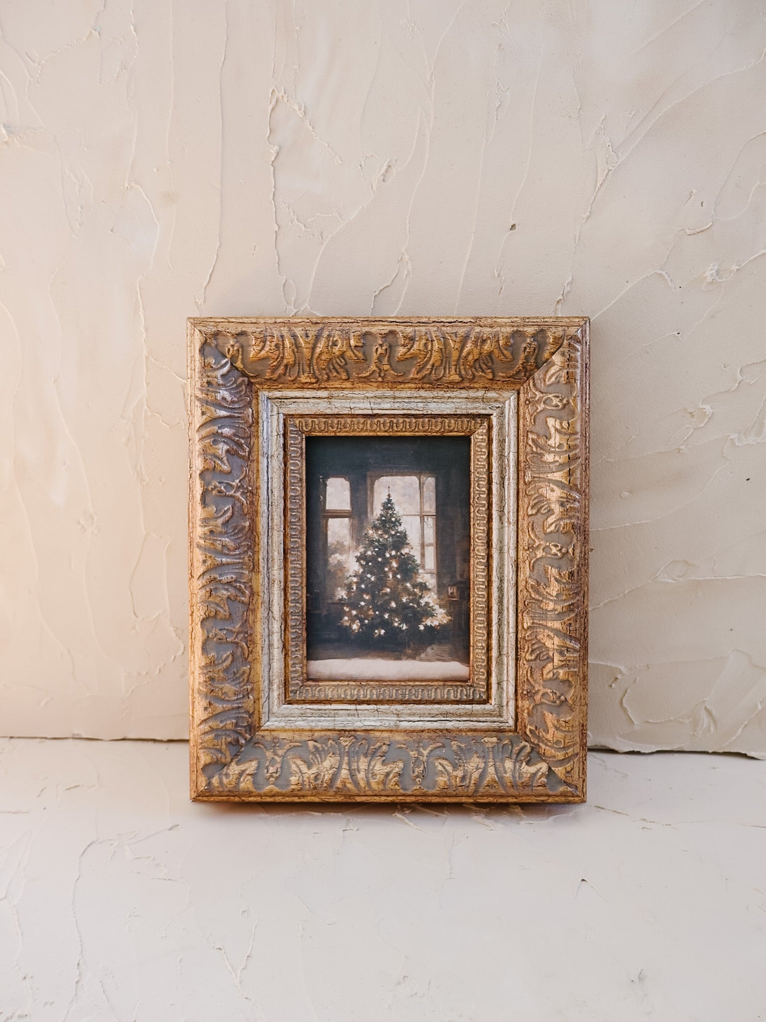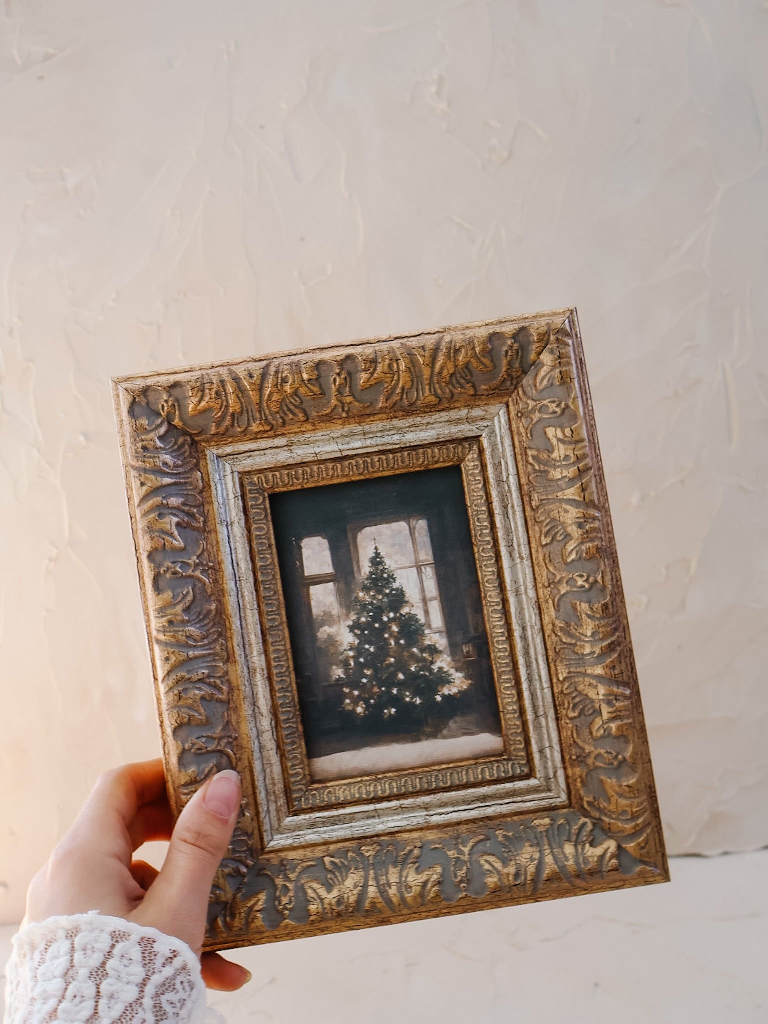 This vintage-inspired Christmas scene is printed on raw canvas and placed in an antiqued frame for an authentic, timeless look. Looks stunning in a small wall space, on a shelf or ledge, or as a part of a gallery wall.