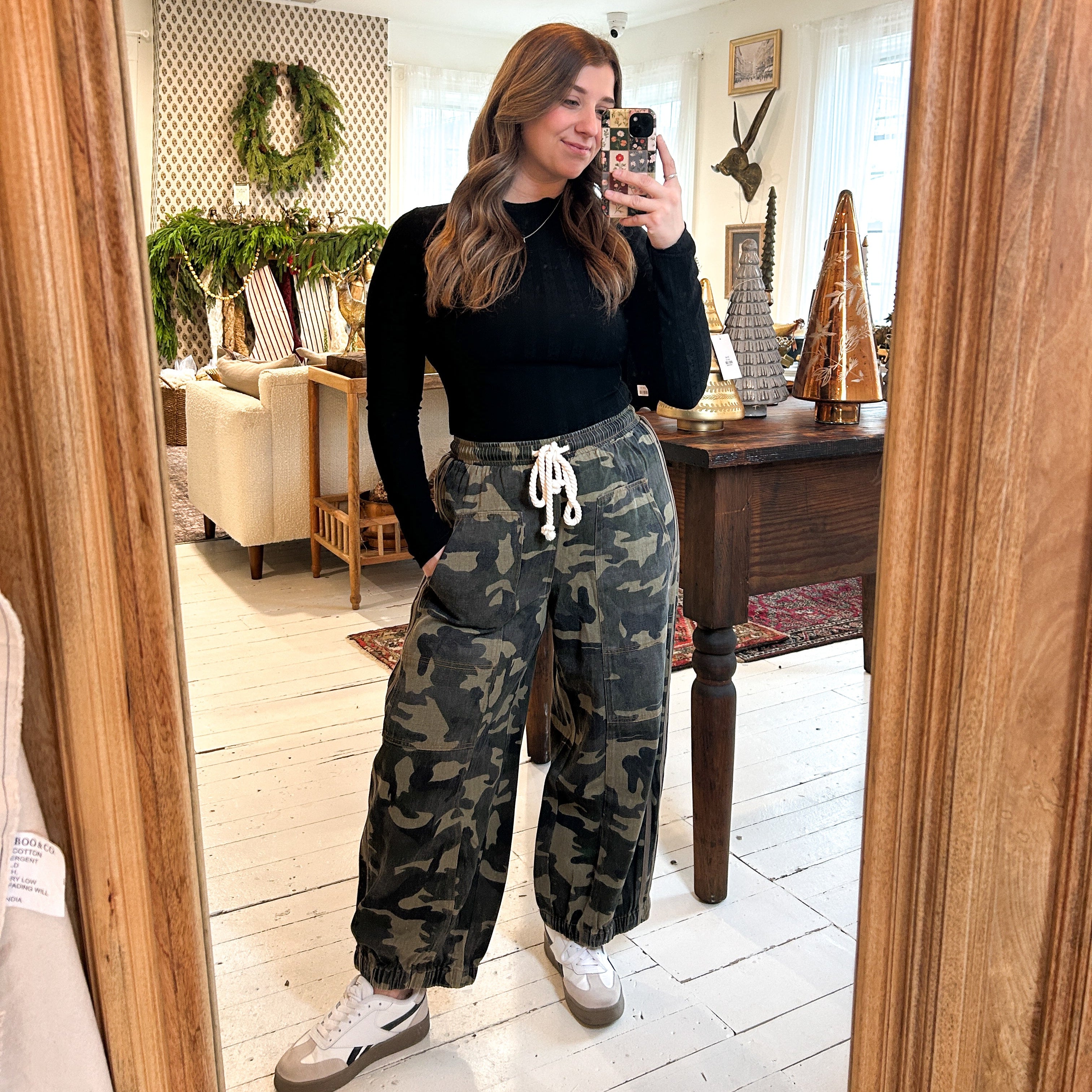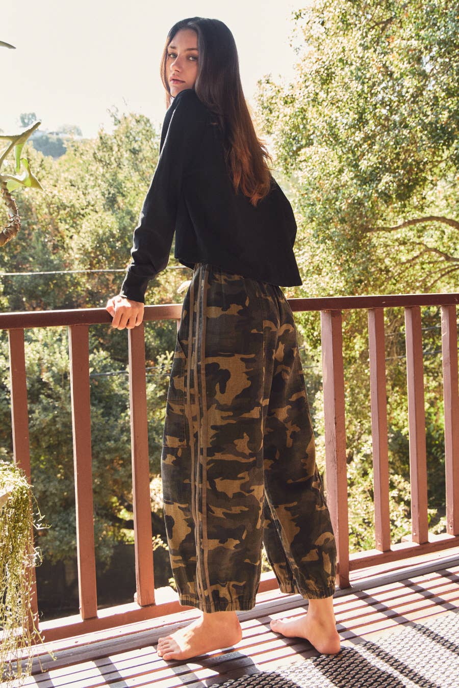 These camo drawstring pants bring that easy, lived-in vibe with a soft elastic waistband, roomy pockets, and a pop of contrast tape along the sides. They’re comfy enough for slow mornings yet cute enough to wear out and about.