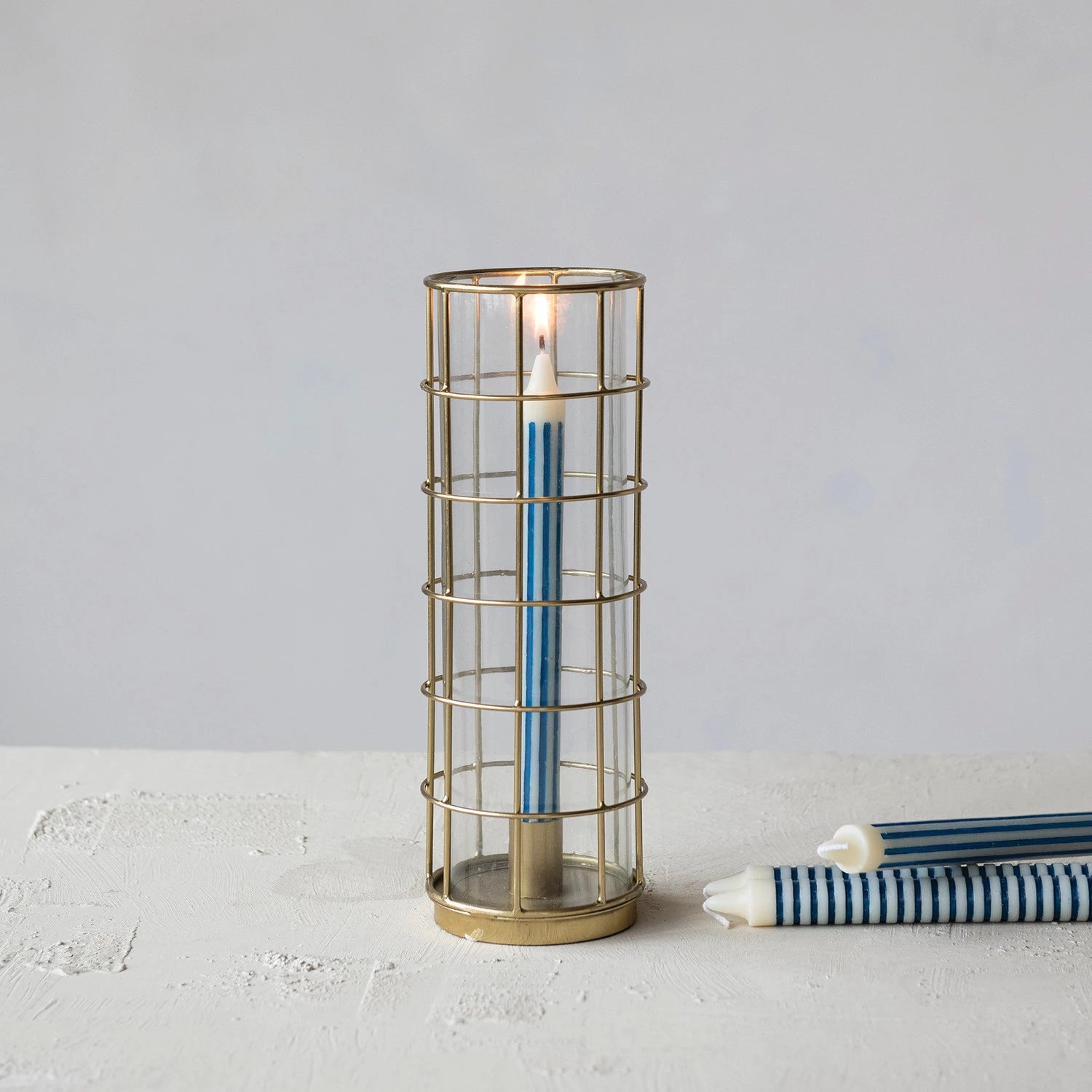This metal taper holder with a glass hurricane creates a warm, ambient glow while adding a sculptural element to your decor. Style it on a dining table, mantel, or sideboard, letting the soft candlelight reflect off the gold finish and glass for an inviting atmosphere that feels cozy, elevated, and perfect for evening gatherings.