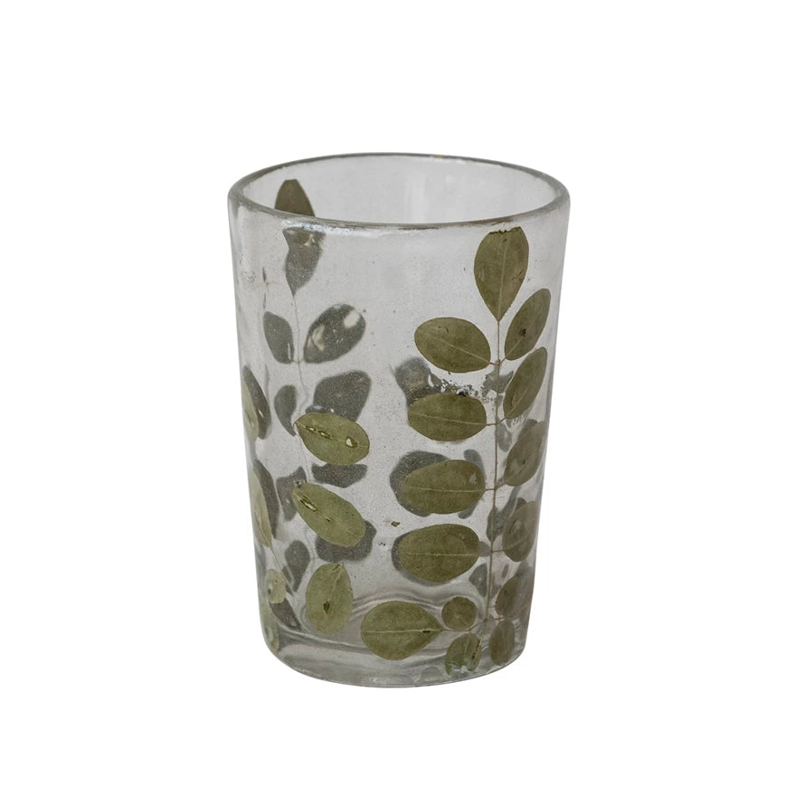 Part of the Moringa Leaf Glass Collection, this tall glass hurricane adds a light height and an easy, organic feel to candle displays. Clear handmade glass is embedded with natural moringa leaves, creating subtle variation and texture that glows softly when lit.