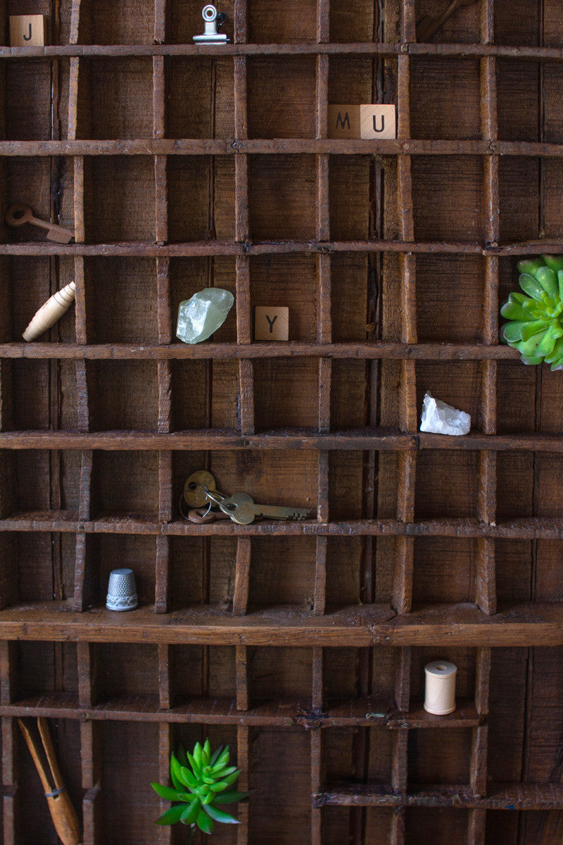 This wooden printers tray is a true antique with a fascinating story to tell. It's up to you to choose how it's told. With its plethora of little compartments, varying in shape and size, this vintage treasure allows you to curate your own piece of wall art. Display your miniature collectibles and keepsakes with quirky charm.