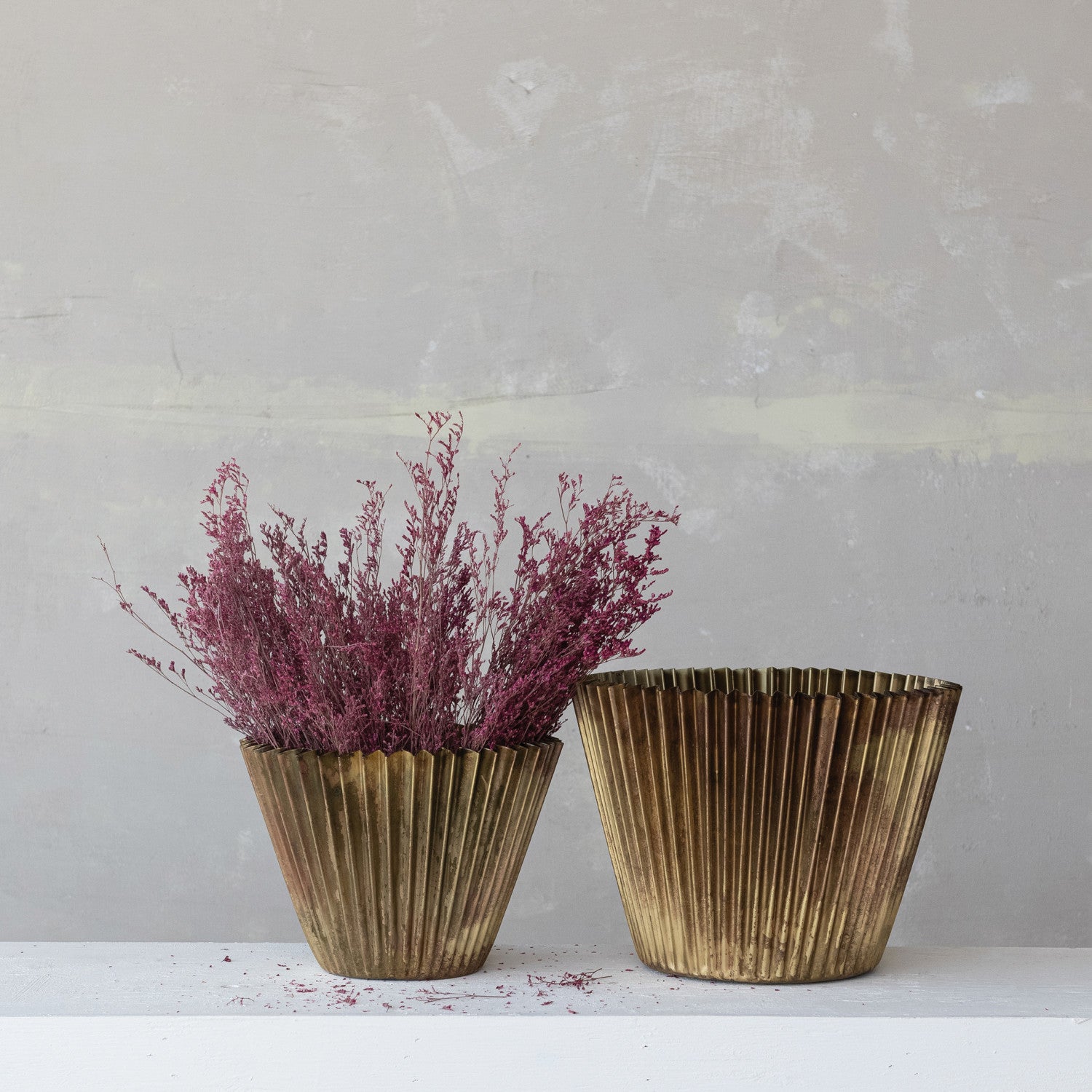 Your large houseplants have found a new home! These metal fluted planters (sold separately) have an antiqued brass finish. Add a houseplant with a plastic saucer to preserve the metal material. They would look lovely with your favorite living houseplants like a snake plant, ZZ, or pothos.