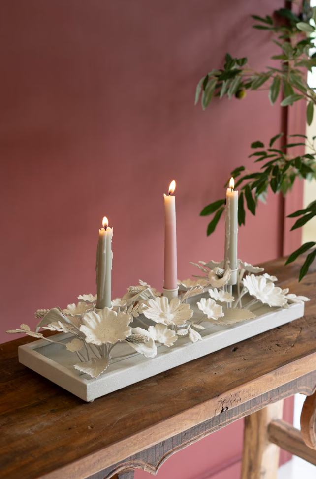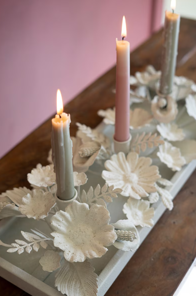 This dreamy taper holder brings a soft, sculptural feel to any surface, with delicate metal florals that feel like they’re blooming right out of the base. It’s designed to hold three tapers and instantly turns a dining table, console, or mantel into something a little more special. The neutral finish makes it easy to mix with whatever you already have, while the floral details add just enough charm to make it a true statement on its own. Style it with classic white tapers for a timeless look or mix in muted tones for a subtle pop - either way, it’s the kind of piece that makes everyday moments feel just a bit more romantic. (Tapers not included.)