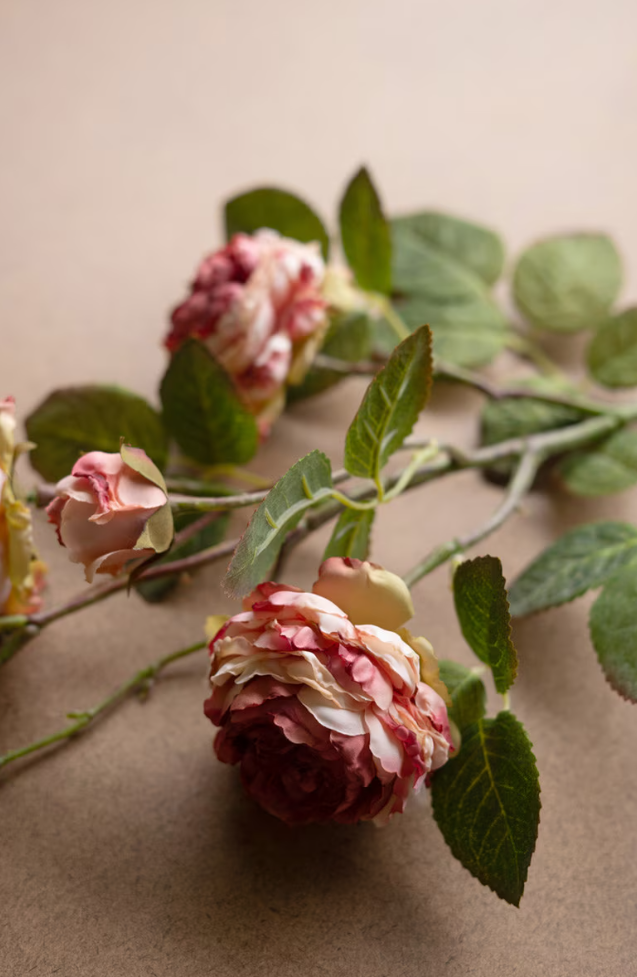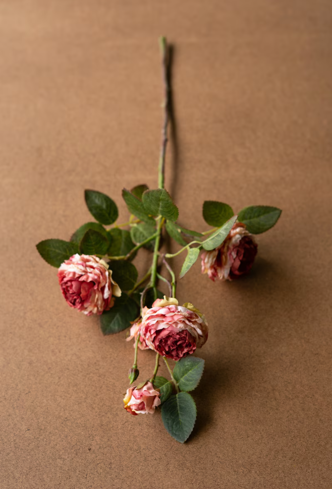 Sold Individually...This rose steam features softly layered blush roses with realistic leaves and natural branching that feel straight out of a freshly cut garden arrangement. At 26" tall, it’s the perfect in-between size for adding gentle height to a vase, tucking into a bedside bottle, or mixing with other stems for a fuller bouquet that still feels effortless. The muted pink tones and subtle variation in the blooms make it easy to style year-round, whether you keep it simple on its own or let it blend into a more collected, relaxed floral moment.