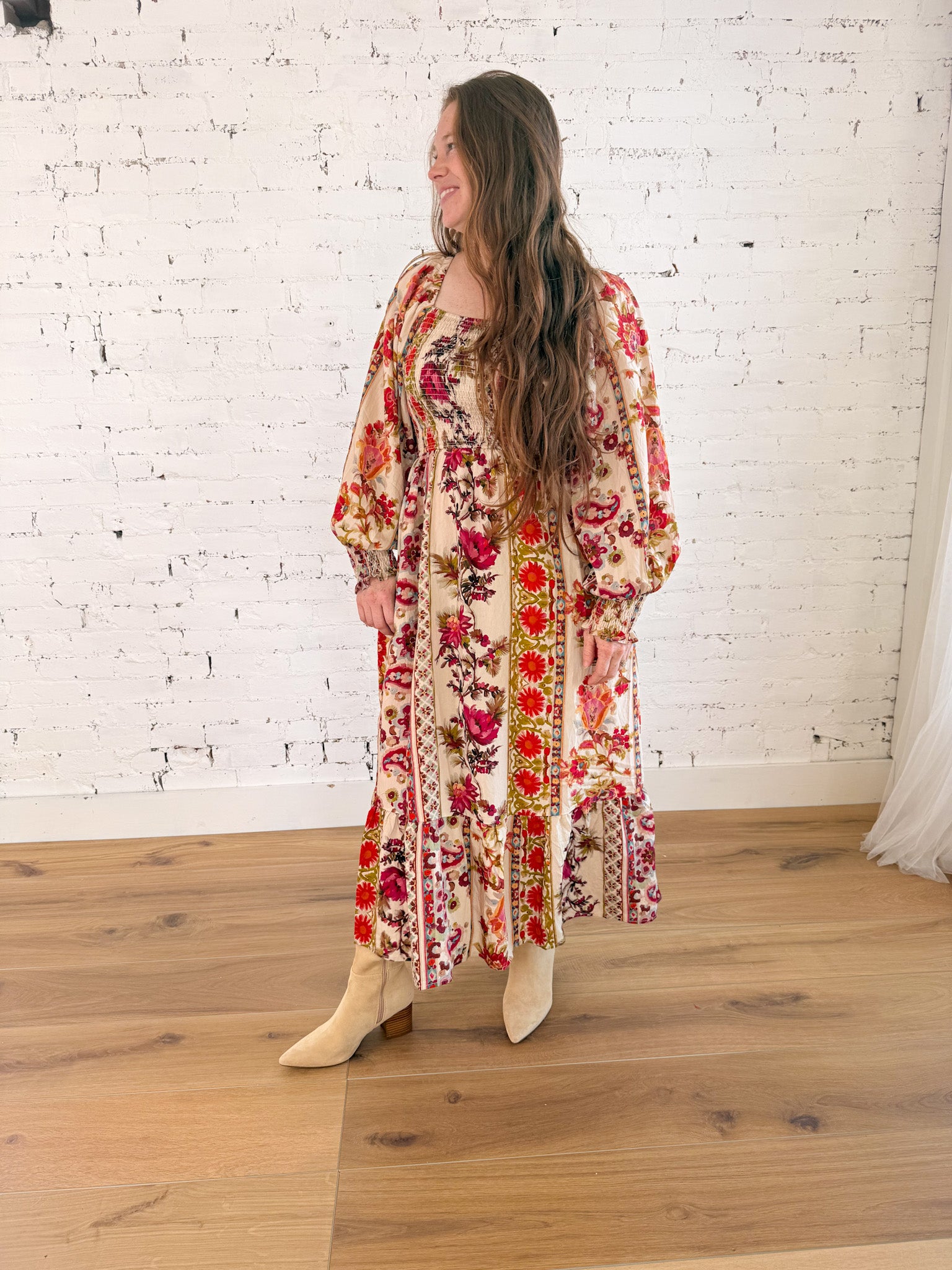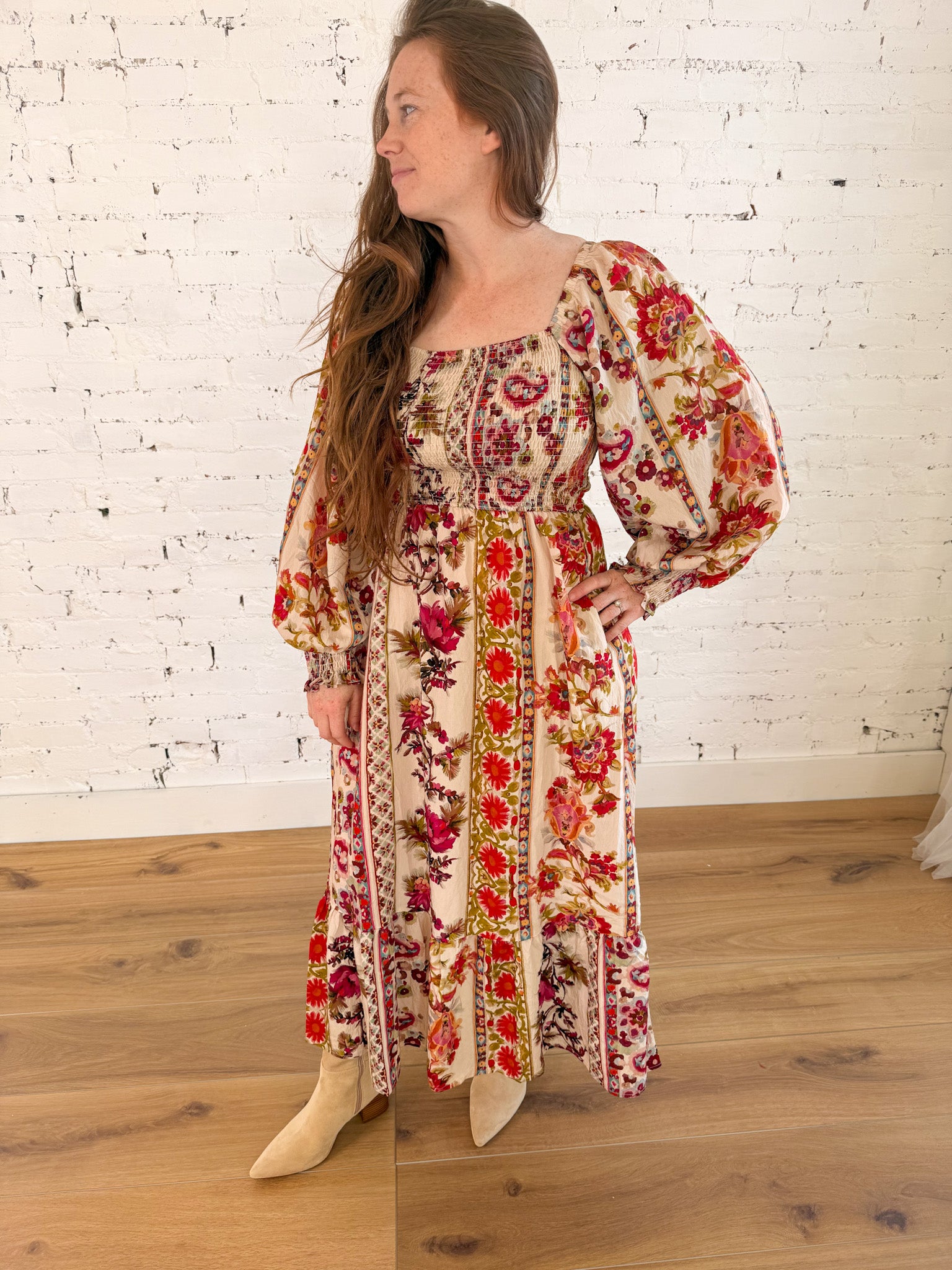 Slip into effortless elegance with this bohemian maxi dress, featuring a romantic floral print that captures free-spirited style. The gathered sleeves and delicate ruffle trim add vintage charm, while the flowing silhouette moves beautifully with you. It has pockets!