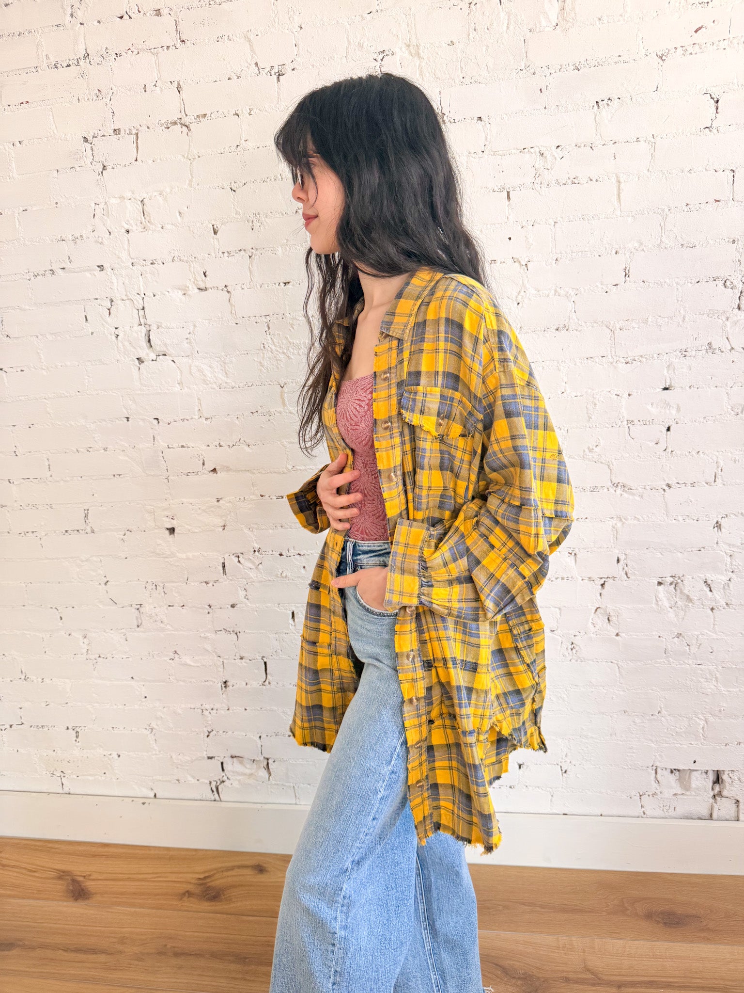 This brings that cozy, lived-in feel we all love. Mineral washed for extra softness, this plaid flannel has a loose, boxy silhouette that feels relaxed. The frayed detailing and rounded hem give it just enough edge, while the mustard tone adds warmth and personality.