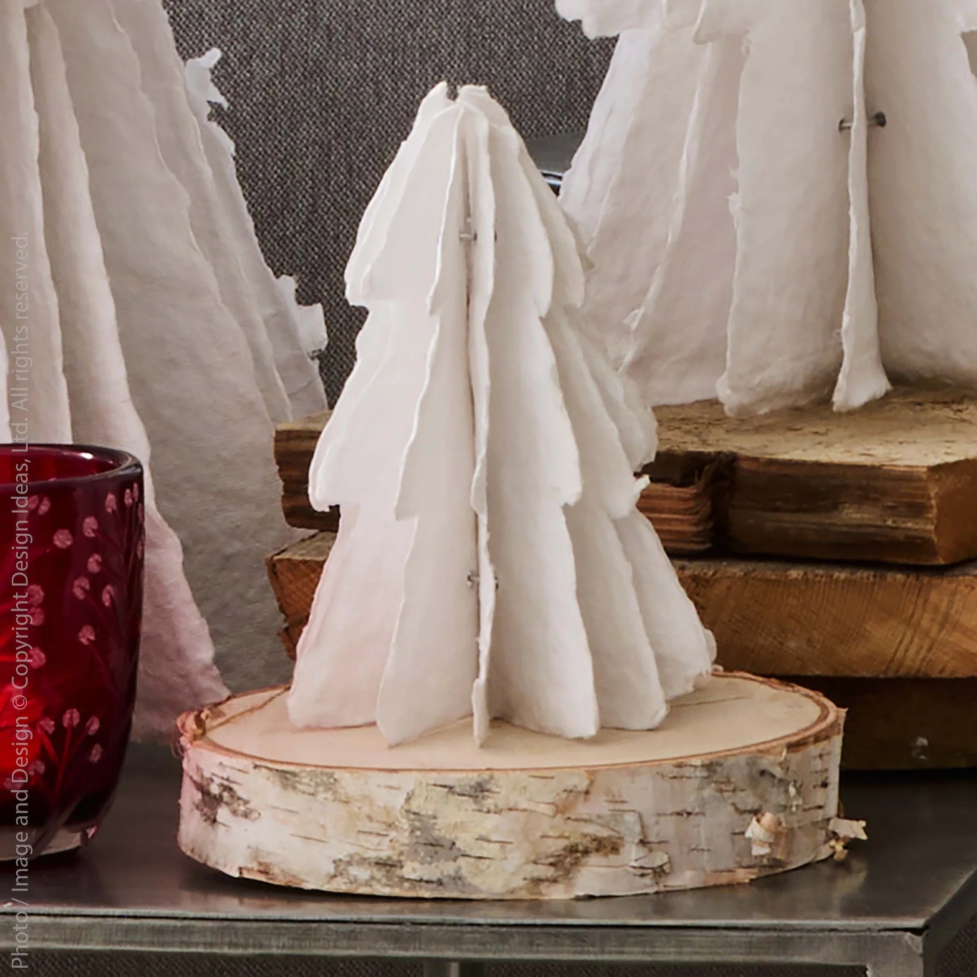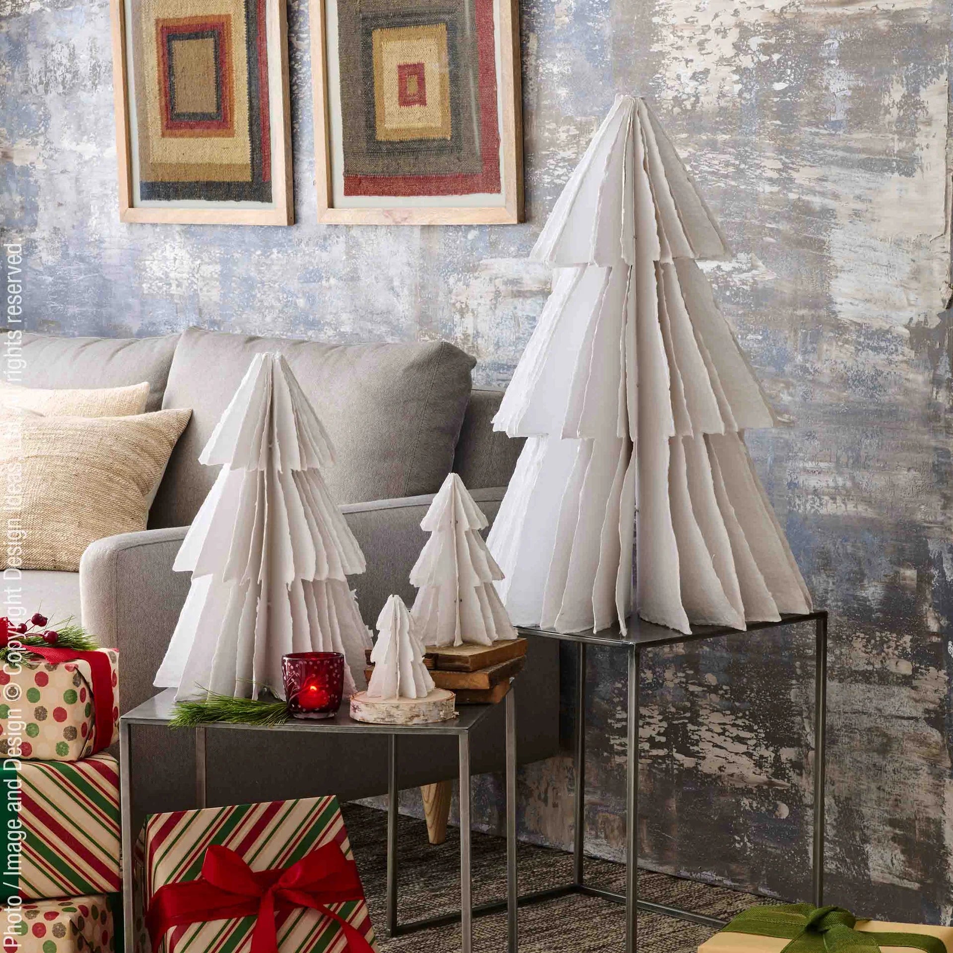 These trees are a charming and festive way to dress up your holiday table. This white decor for Christmas is made of cotton paper and features a paper tree design. These trees are made in India and is a sustainable, eco-friendly choice for your holiday decorating.