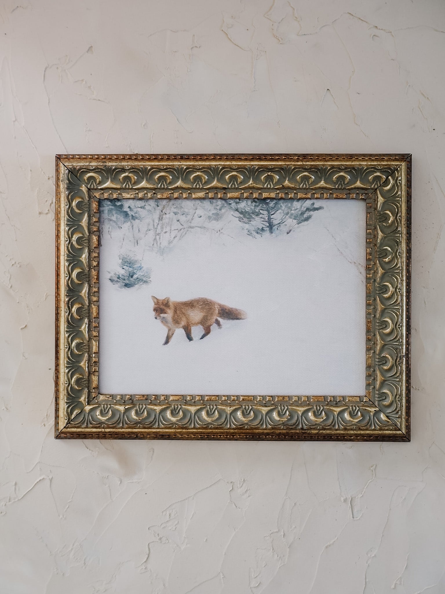 This vintage-inspired landscape of a fox in the snow is printed on raw canvas and placed in an antiqued frame for an authentic, timeless look. Looks stunning in a small wall space, on a shelf or ledge, or as a part of a gallery wall.