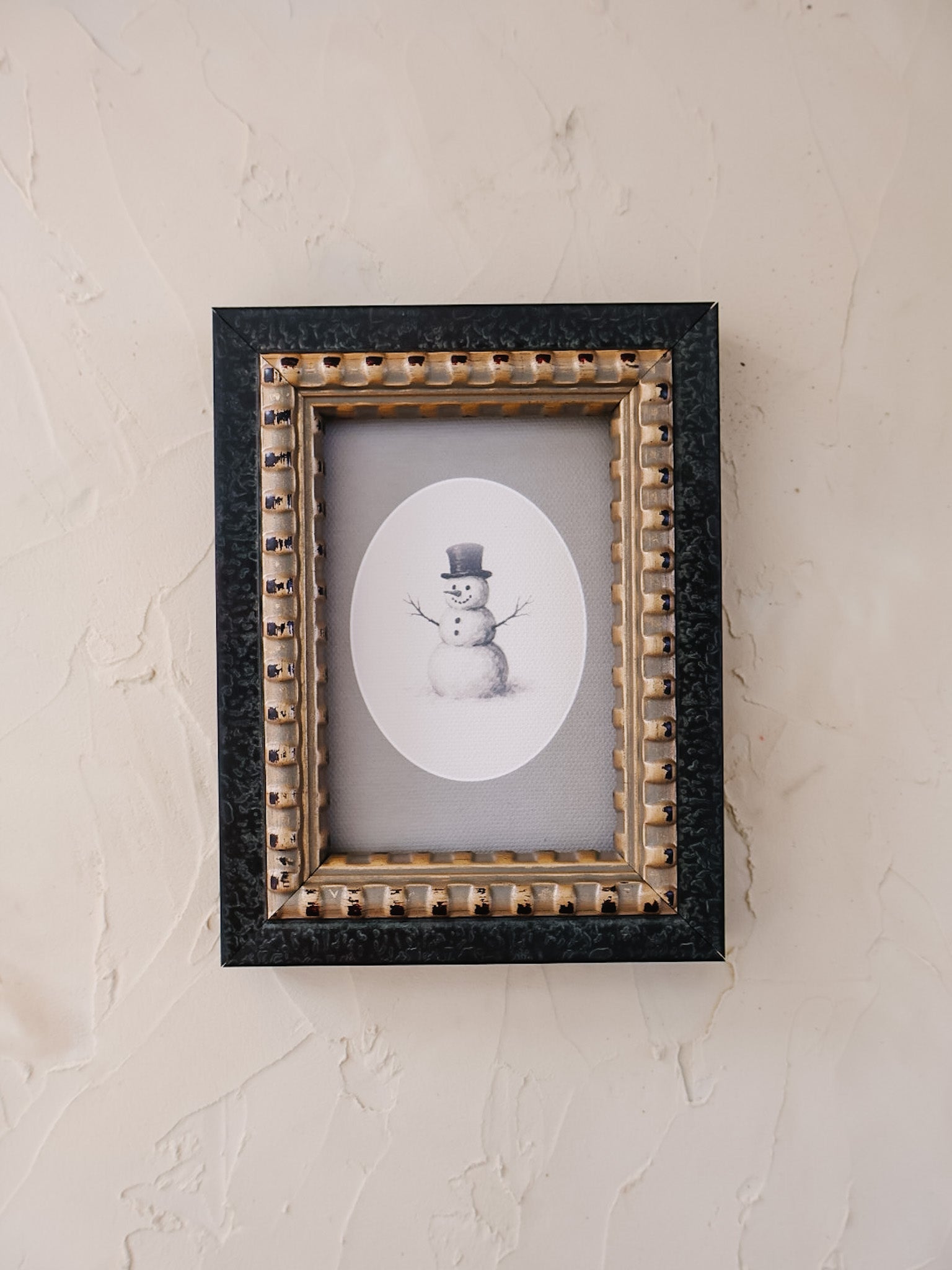 This vintage-inspired art features a black and white snowman with a figure and animal in the distance. It is printed on raw canvas and placed in an antiqued frame for an authentic, timeless look. Looks stunning in a small wall space, on a shelf or ledge, or as a part of a gallery wall.